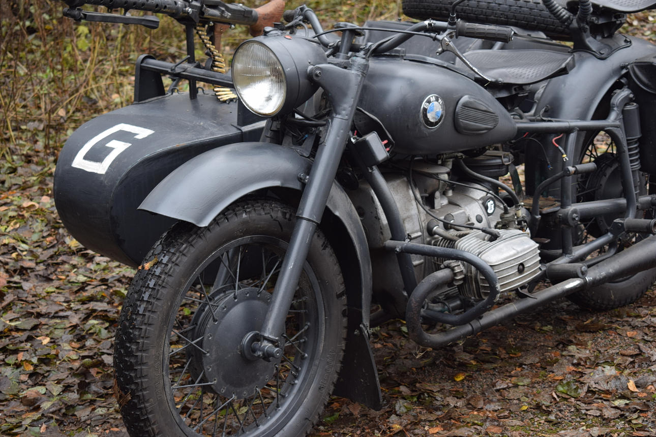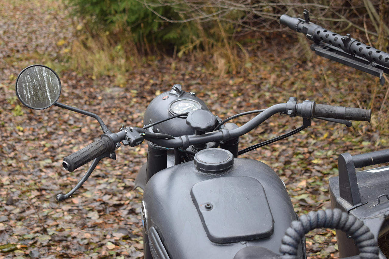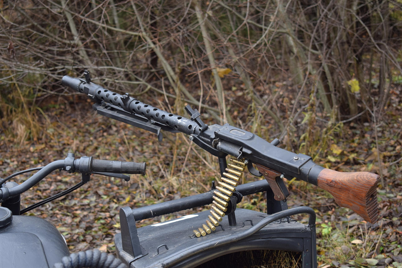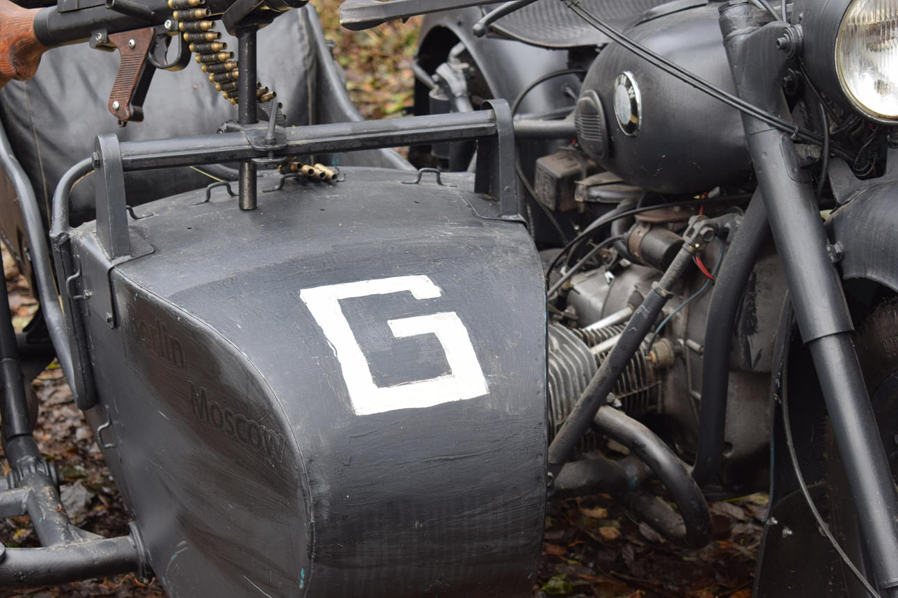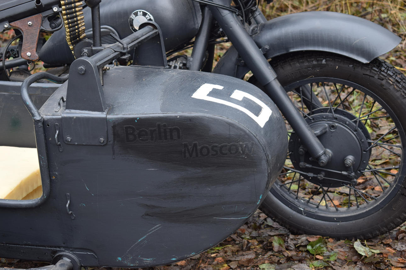 Reconstruida en una motocicleta del ejército alemán con el emblema BMW y la ametralladora Réplica MG34.