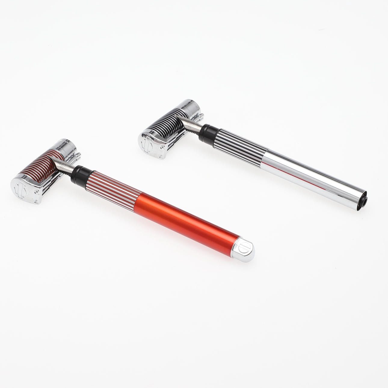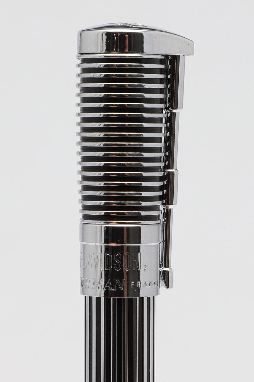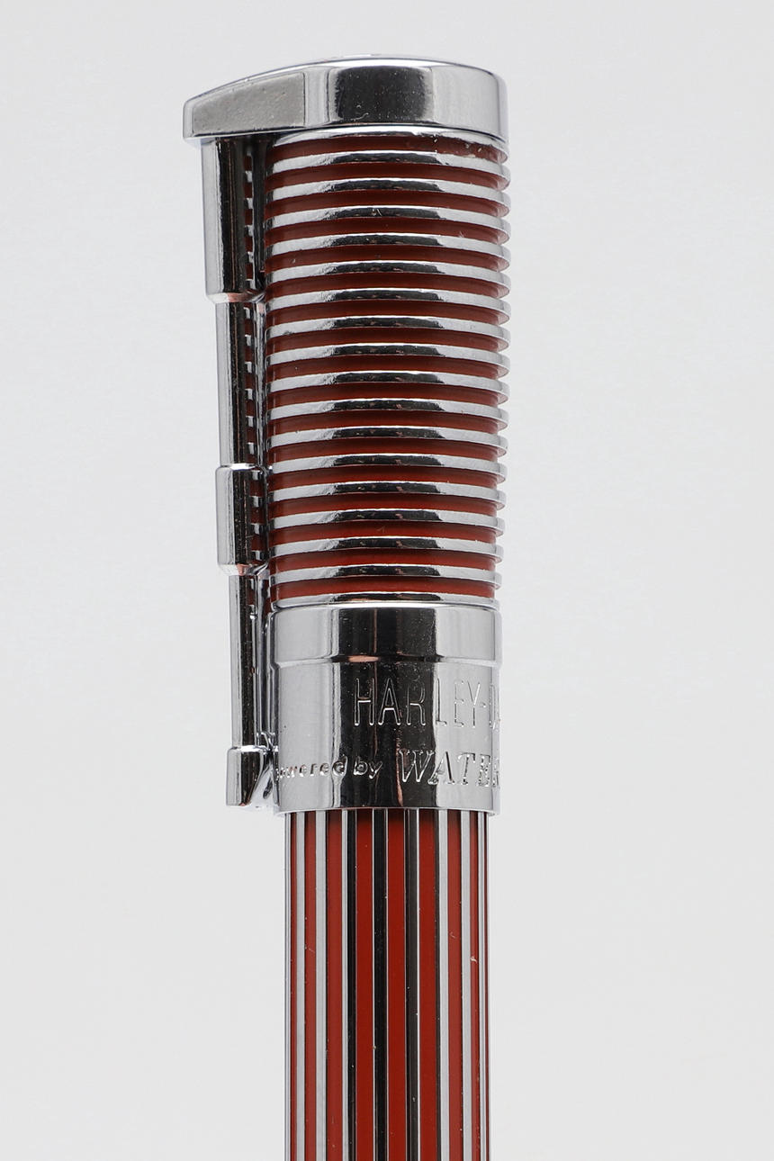 uno con carcasa roja y cromada, el otro en cromo y negro, diseñado para parecerse a un pistón y el clip como las horquillas delanteras de una motocicleta con una Harley Davidson (2).