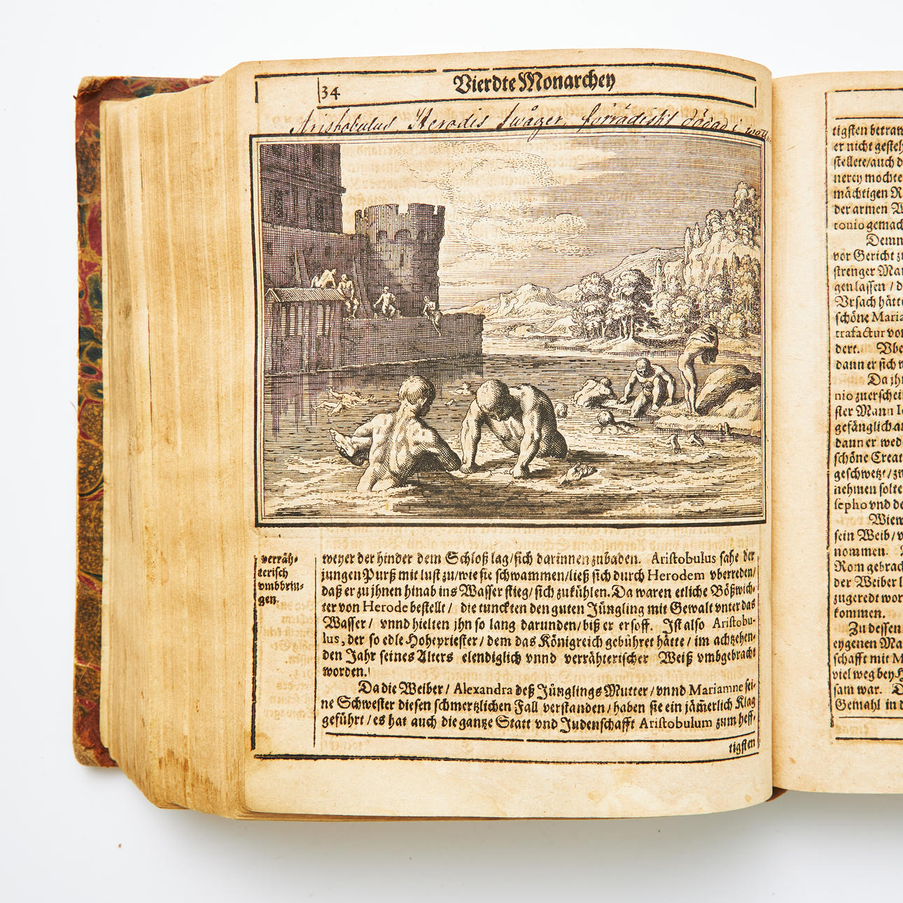 Alexandrum M. vom Jahr der Schöpffung 3410 biss 3620. Hin and wider in the world denckwürdig zügetragen... Fráncfort, Matthaeus Merian, (1636). 4to. Ing. title, 3-5, (engr. página), 6, (engr. página), 7, (engr. página), 8, (en blanco), 9-170 págs. Ricamente