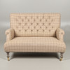 De estilo vintage, con tapicería estampada, patas delanteras torneadas y ruedas de latón. 93 cm de altura x 128 cm de largo x 80 cm de profundidad. Altura del asiento 41cm.