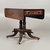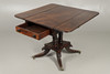 la parte superior rectangular con solapas abatibles, tiene un solo cajón con friso y un cajón falso, todos levantados sobre una columna torneada con patas en forma de cuatriforme talladas y ruedas de latón, de 90 cm x 50 cm (90 cm extendidas) x 72 cm de altura.