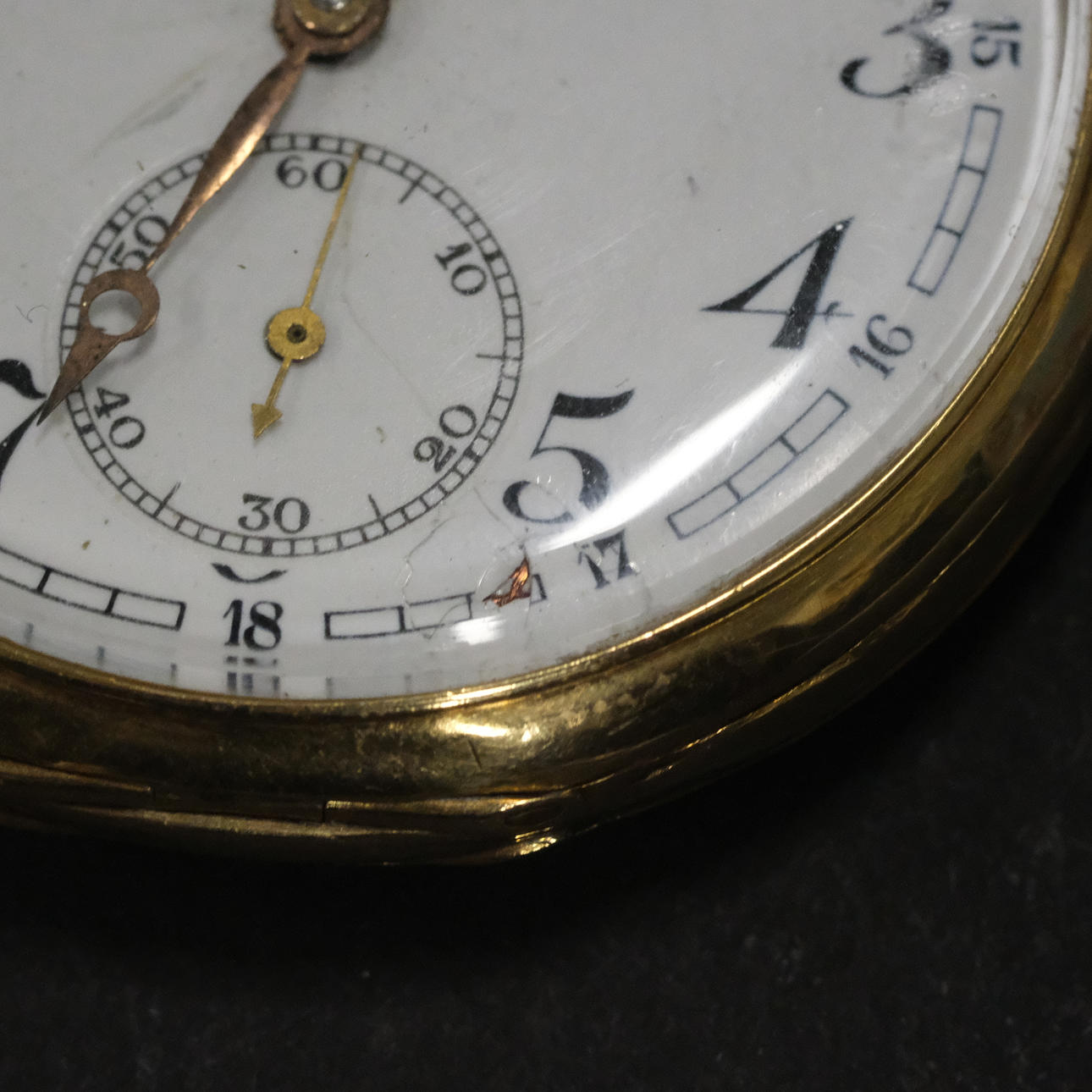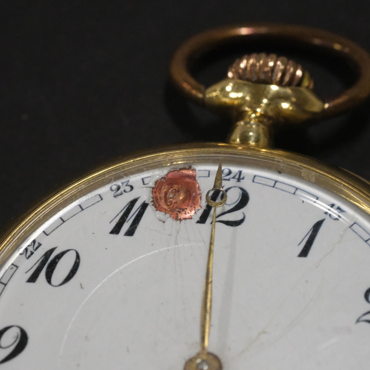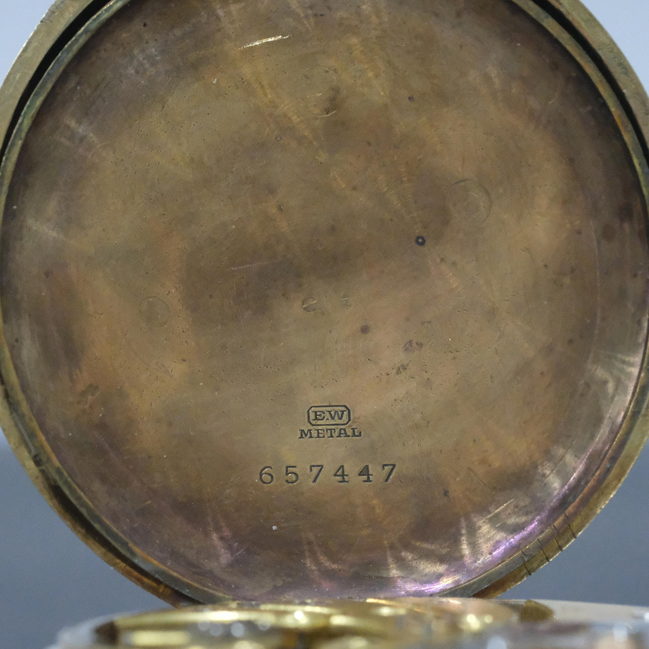 Carcasa interior con grabado. Parece funcionar. No se ofrece ninguna garantía funcional. Funda exterior con cualquier abolladura. La esfera se dañó entre las 11 y las 12, así como a las 5. Algunas grietas.
