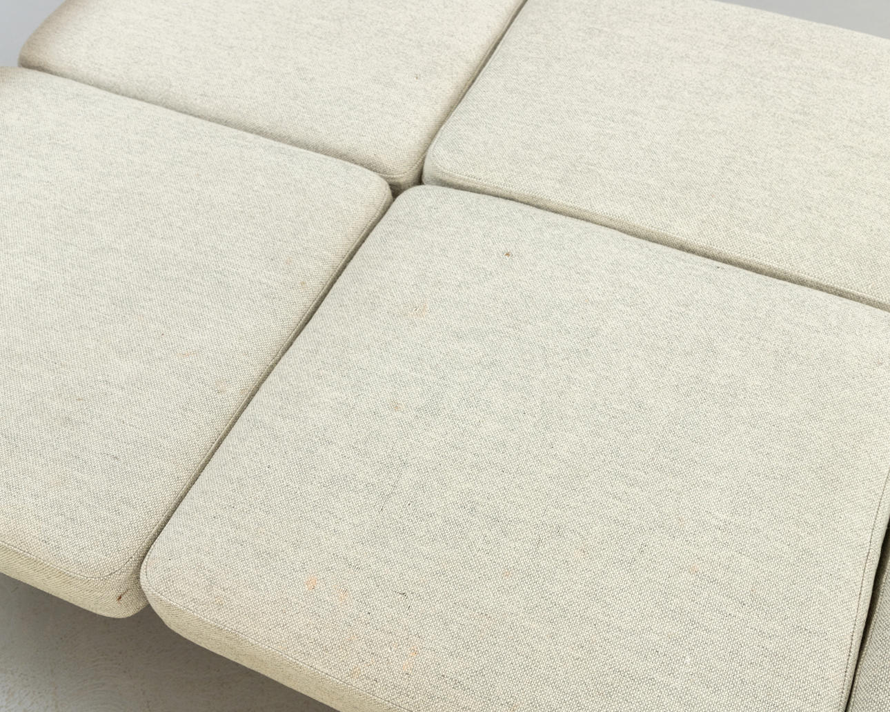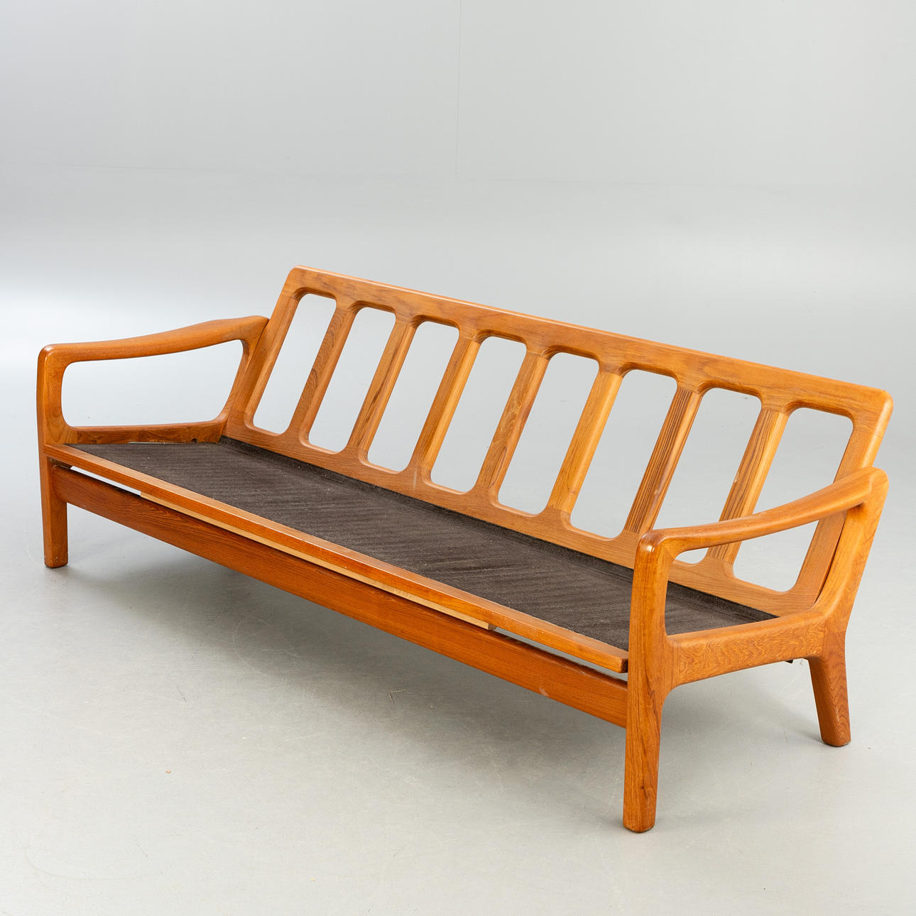 Teca maciza. Cojines holgados cubiertos con tela de lana de color gris claro. Marcado con sello.