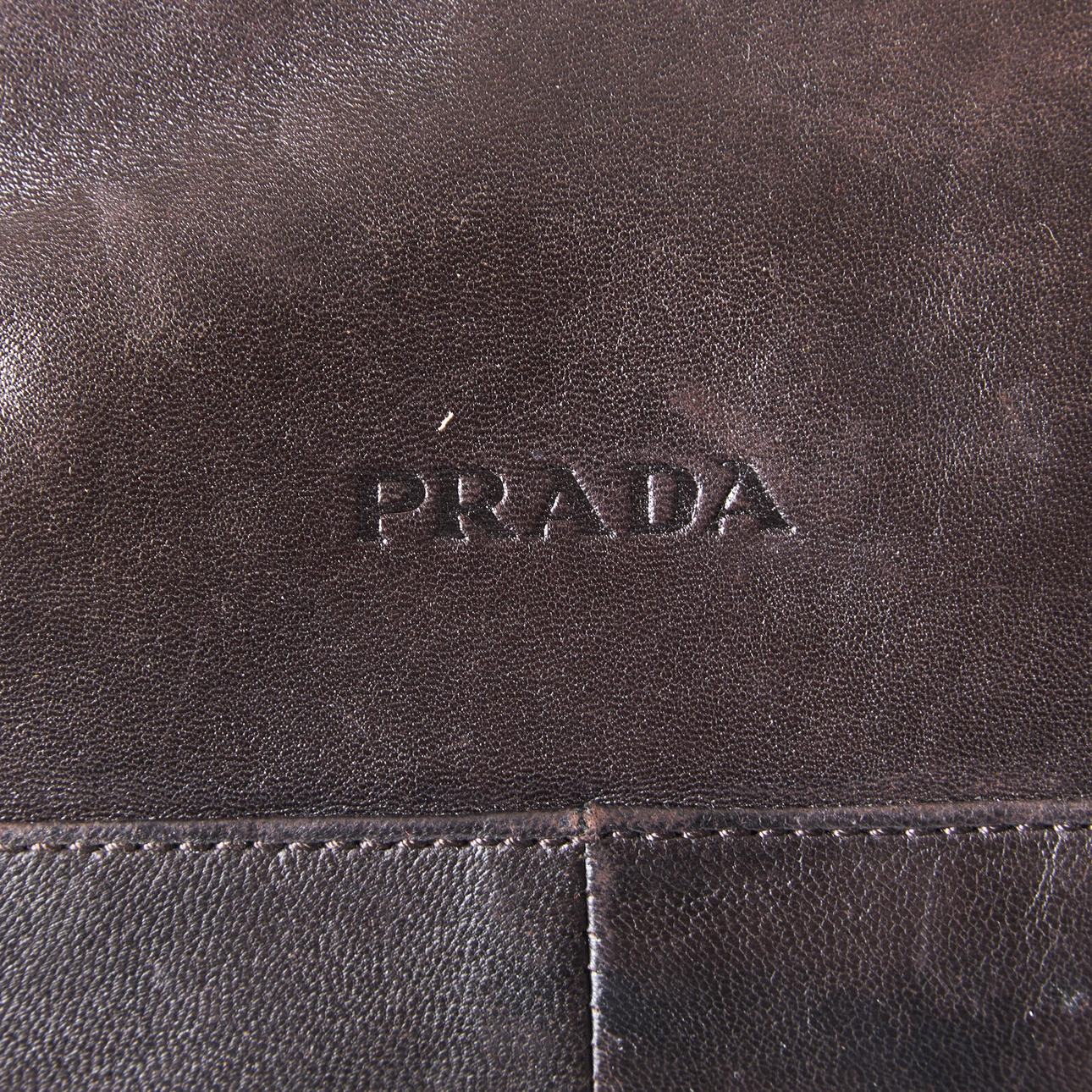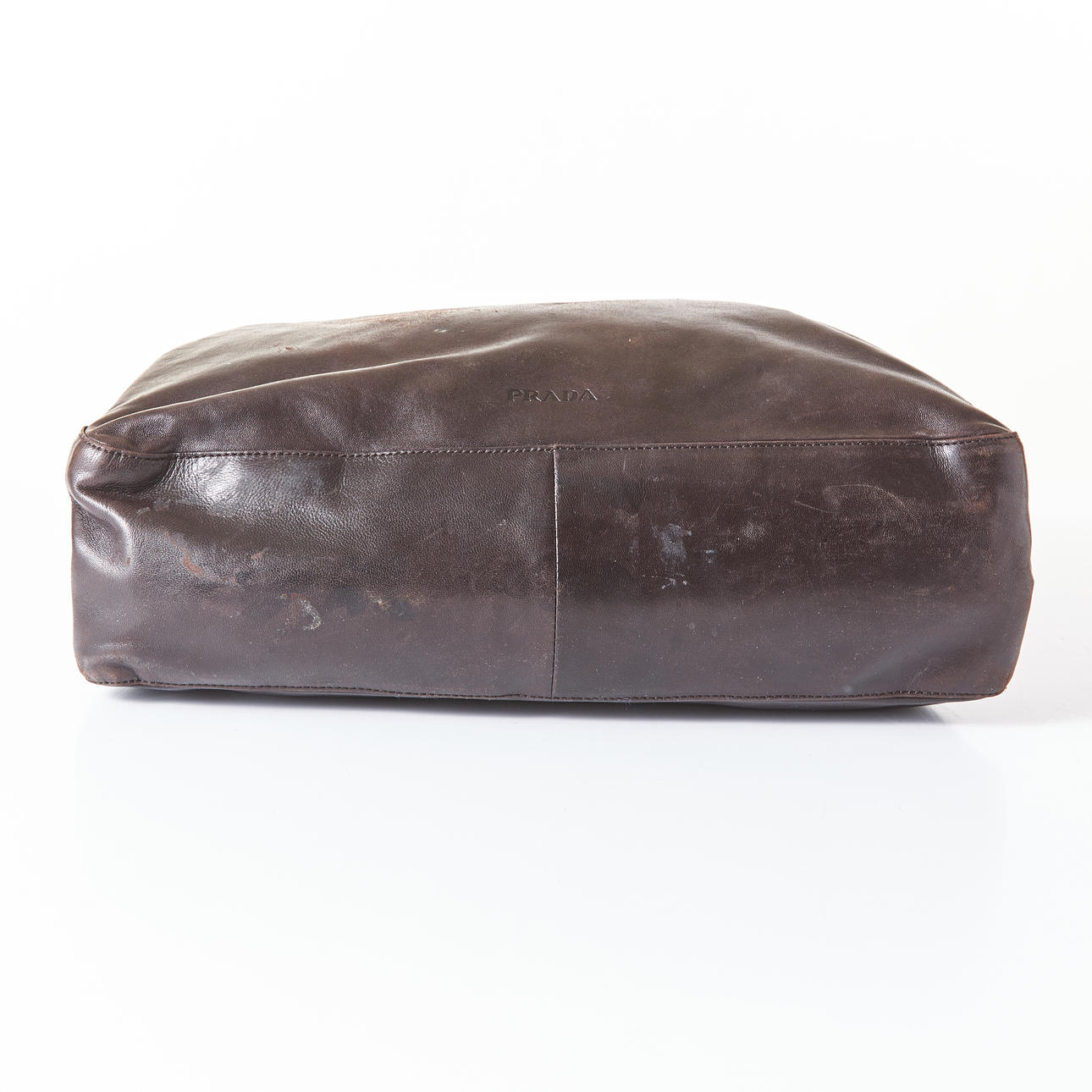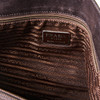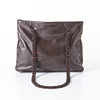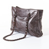 Piel marrón oscuro, asas de cadena con zapatos de piel en plástico marrón, placa de identificación en el interior, interior con dos bolsillos con cremallera. Bolsa guardapolvo asociada.