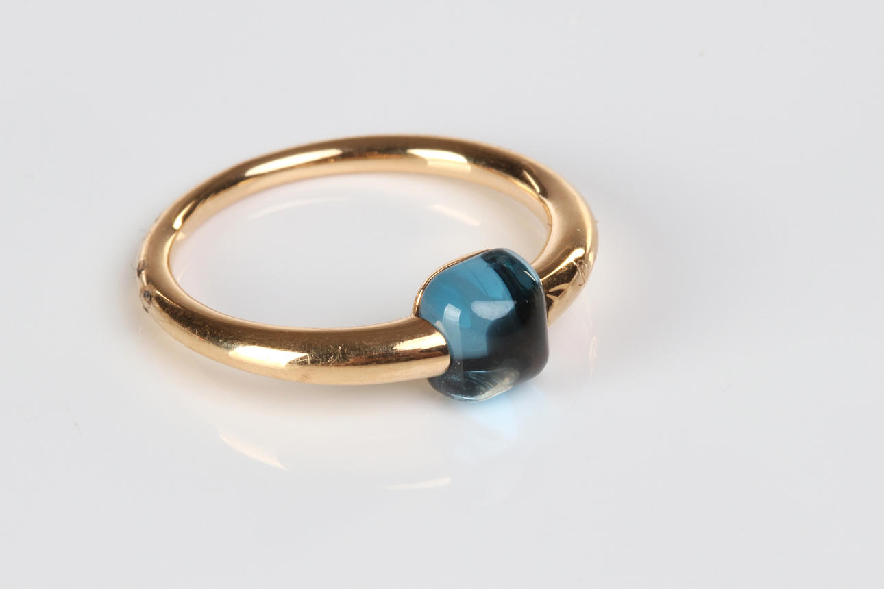 18 quilates con un topacio tallado en cabujón de aproximadamente 6,5 x 5,5 mm, tamaño. ca 17,5 mm, peso total 3,6 g.