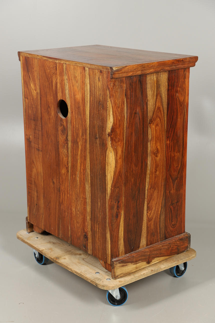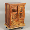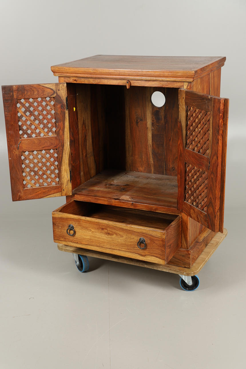 El armario de doble puerta con celosía de teca y tachuelas de latón, sobre un solo cajón largo. Tiradores con forma de anillo de metal. 95 cm de altura x 72,5 cm de ancho x 51 cm de profundidad.