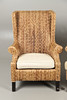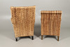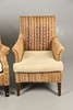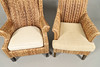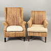 Incluye un sillón con respaldo de rafia (105 cm de altura) y un sillón (90 cm de altura), ambos con patas de madera y cojines. (2).