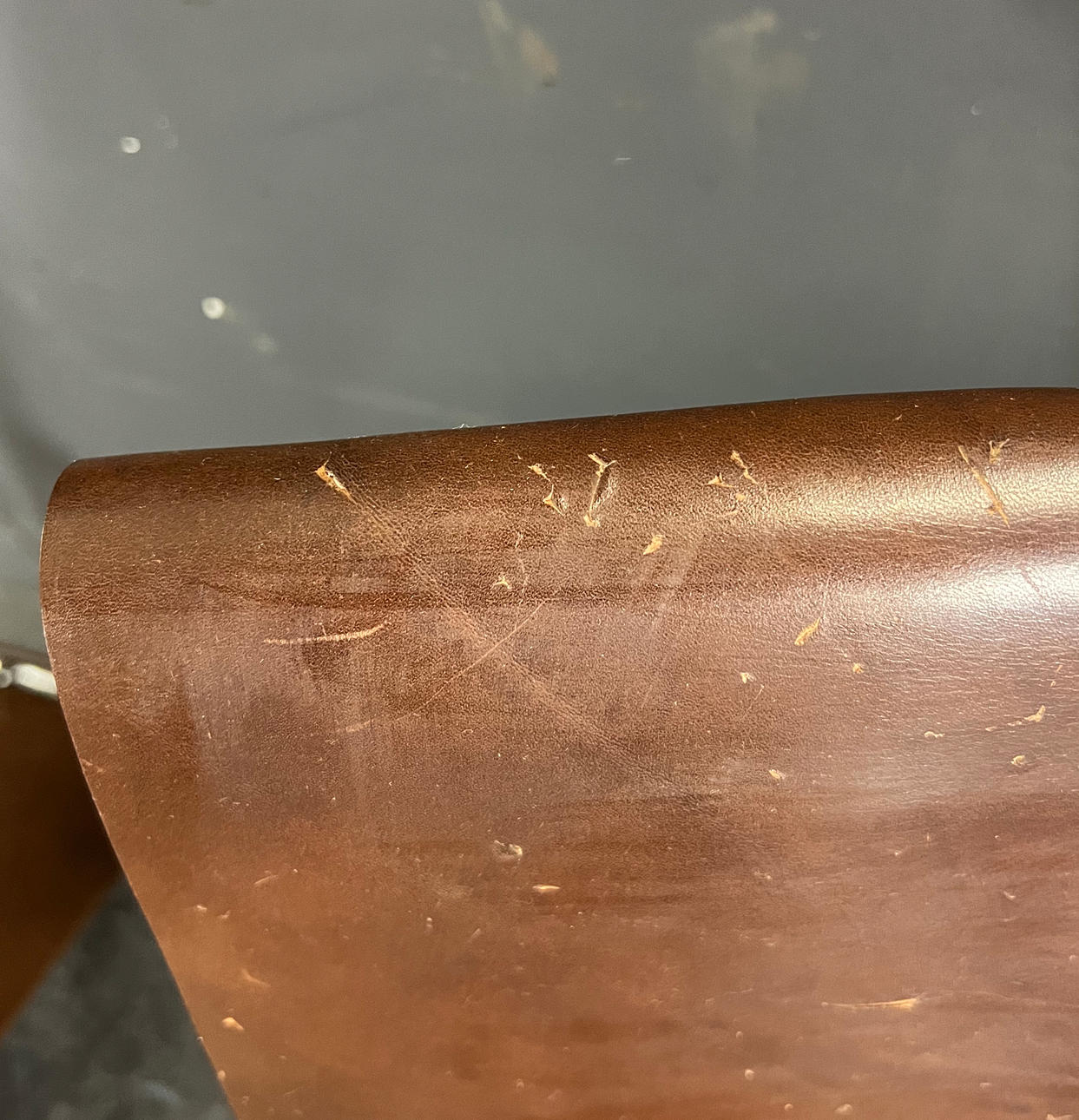 La piel presenta signos normales de desgaste, como arañazos.