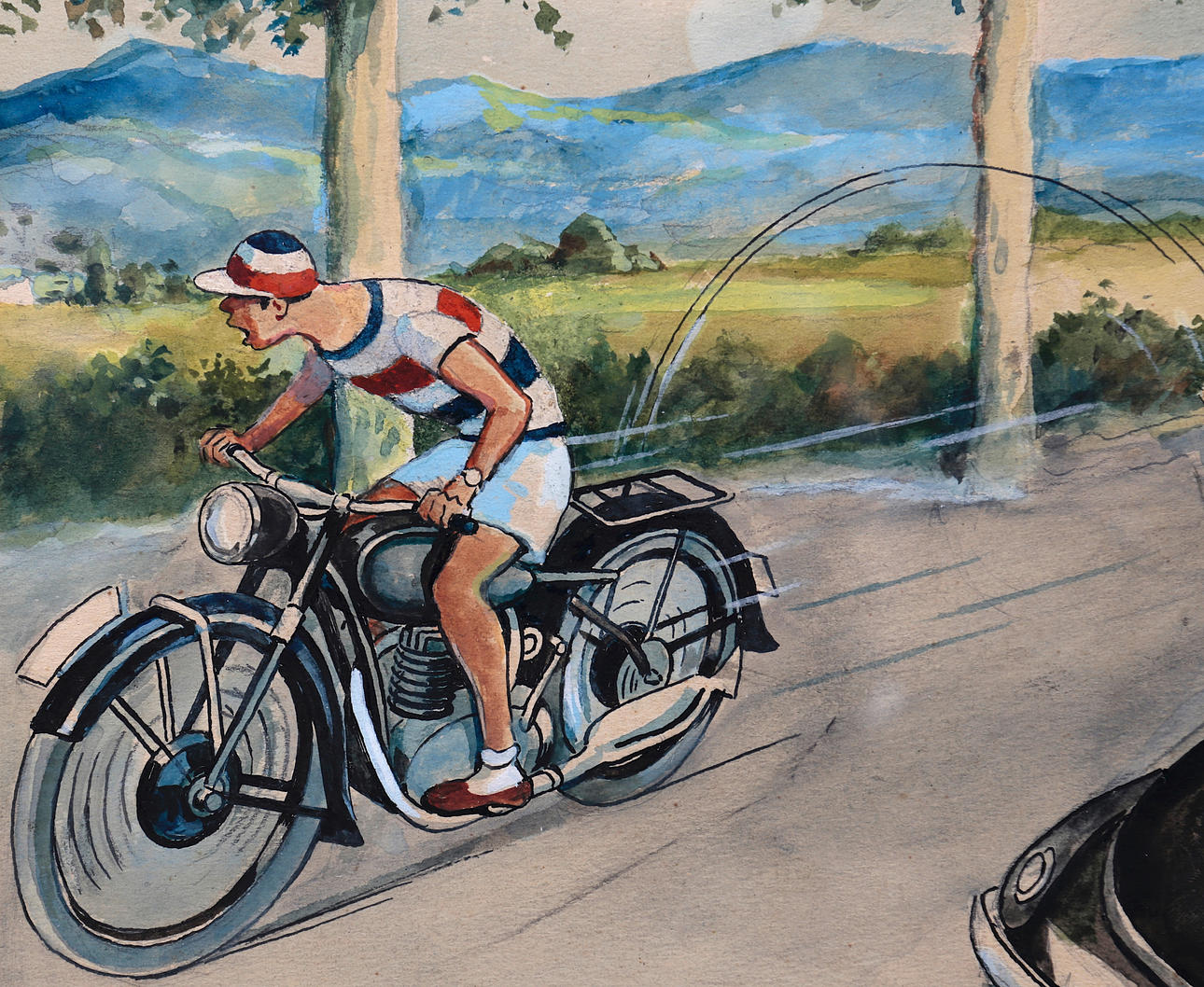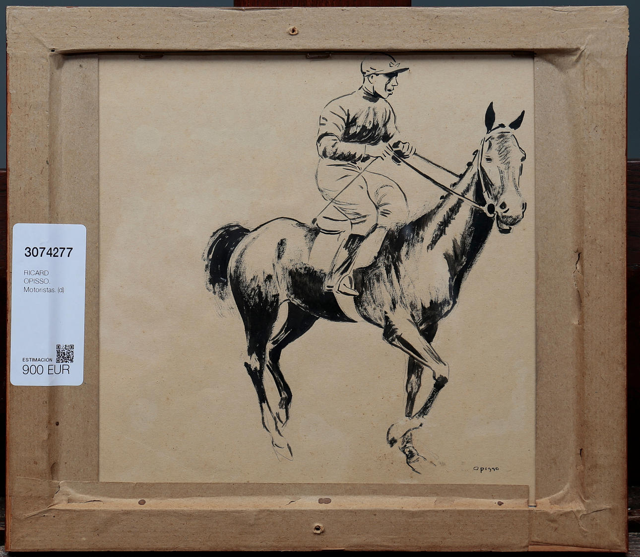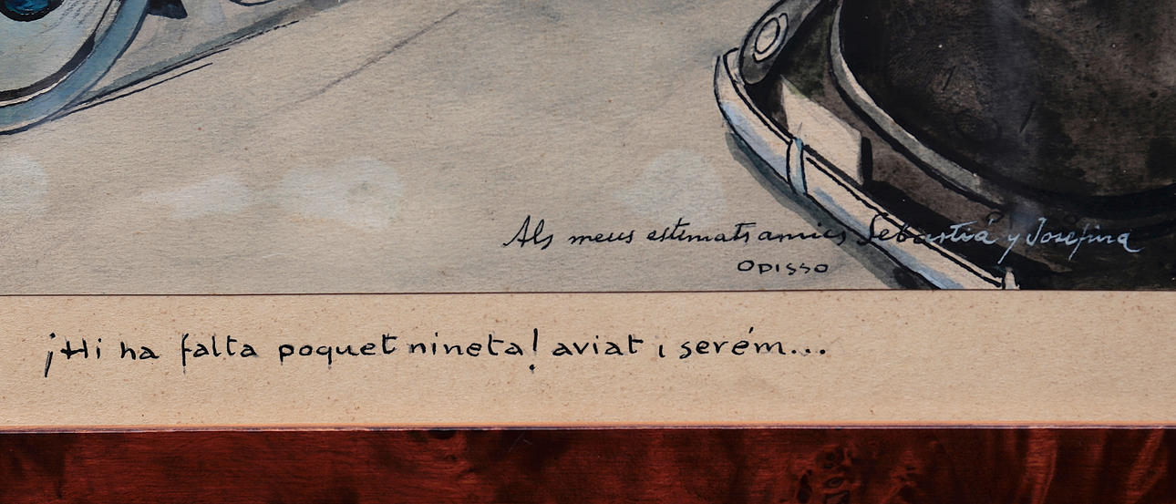 Firmado, dedicado y con leyenda: "¡Hi ha falta poquet nineta! aviat i serém...". En el reverso, un dibujo a tinta, también firmado, representando un jockey (24,5x28 cm)