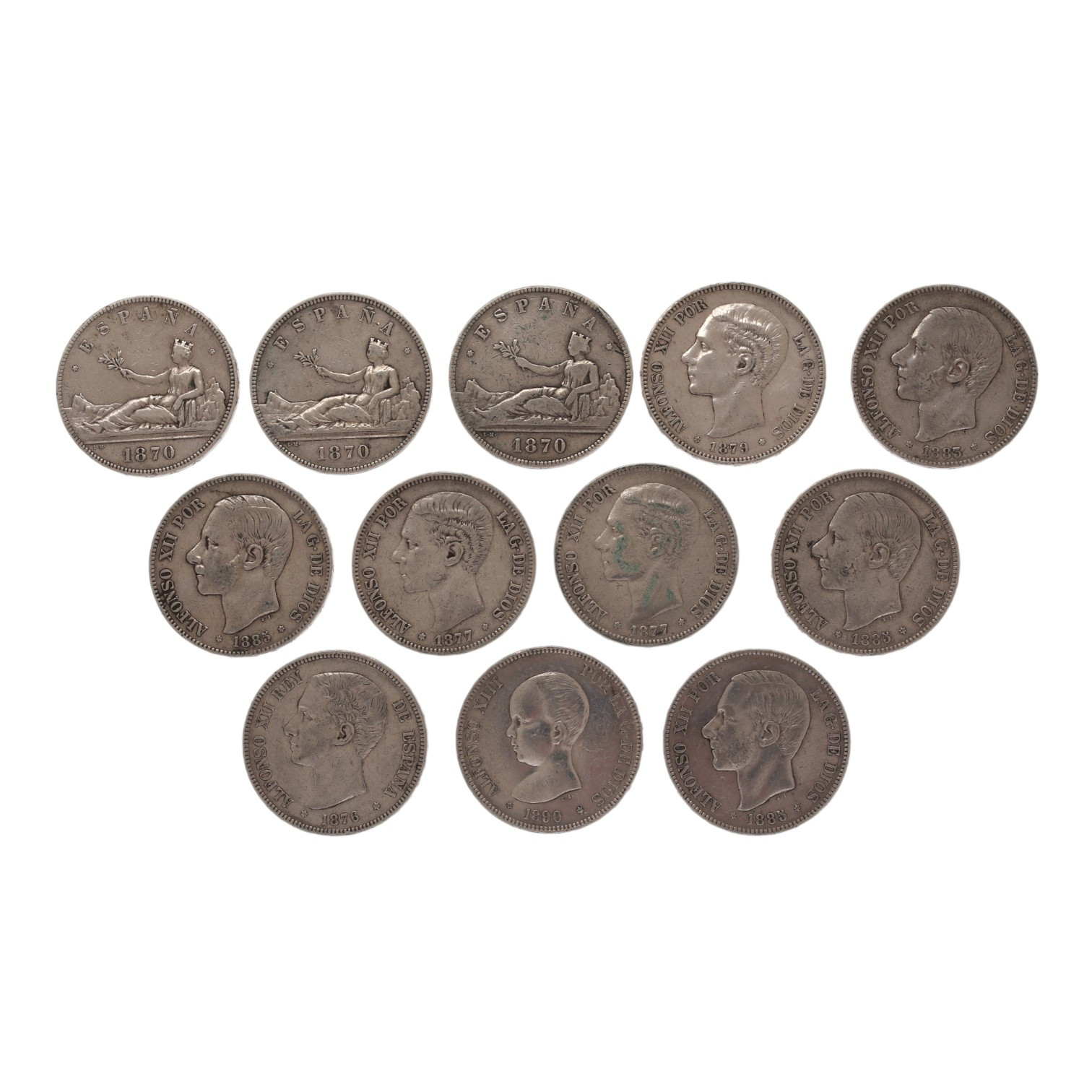 3254522. Doce monedas españolas en plata.