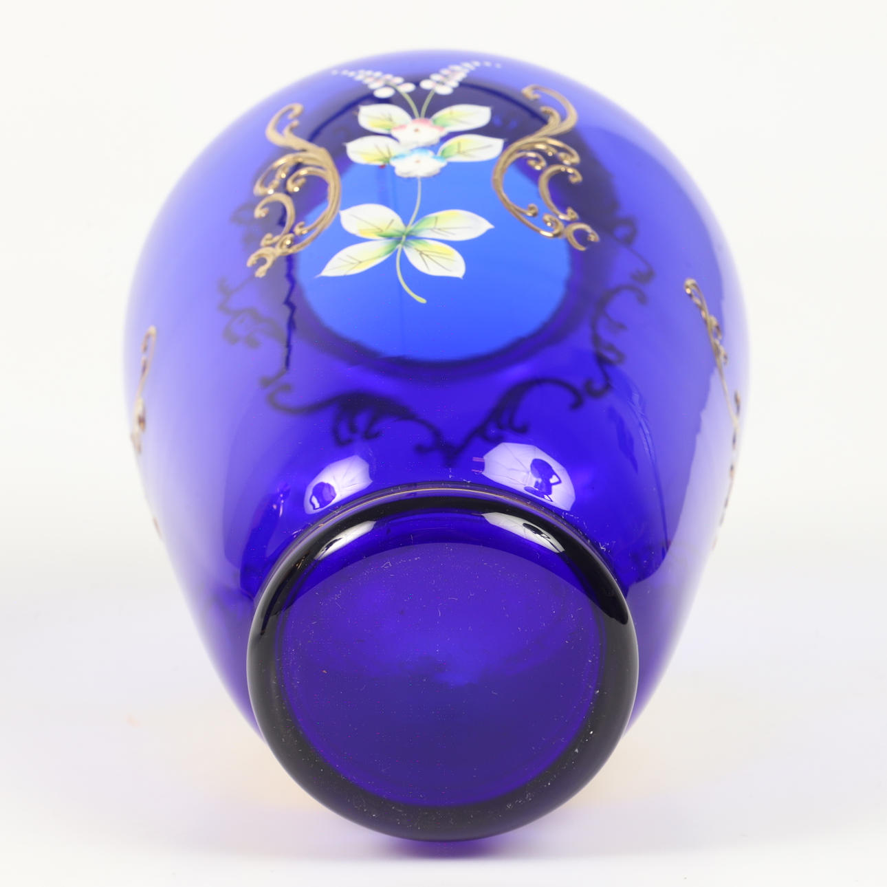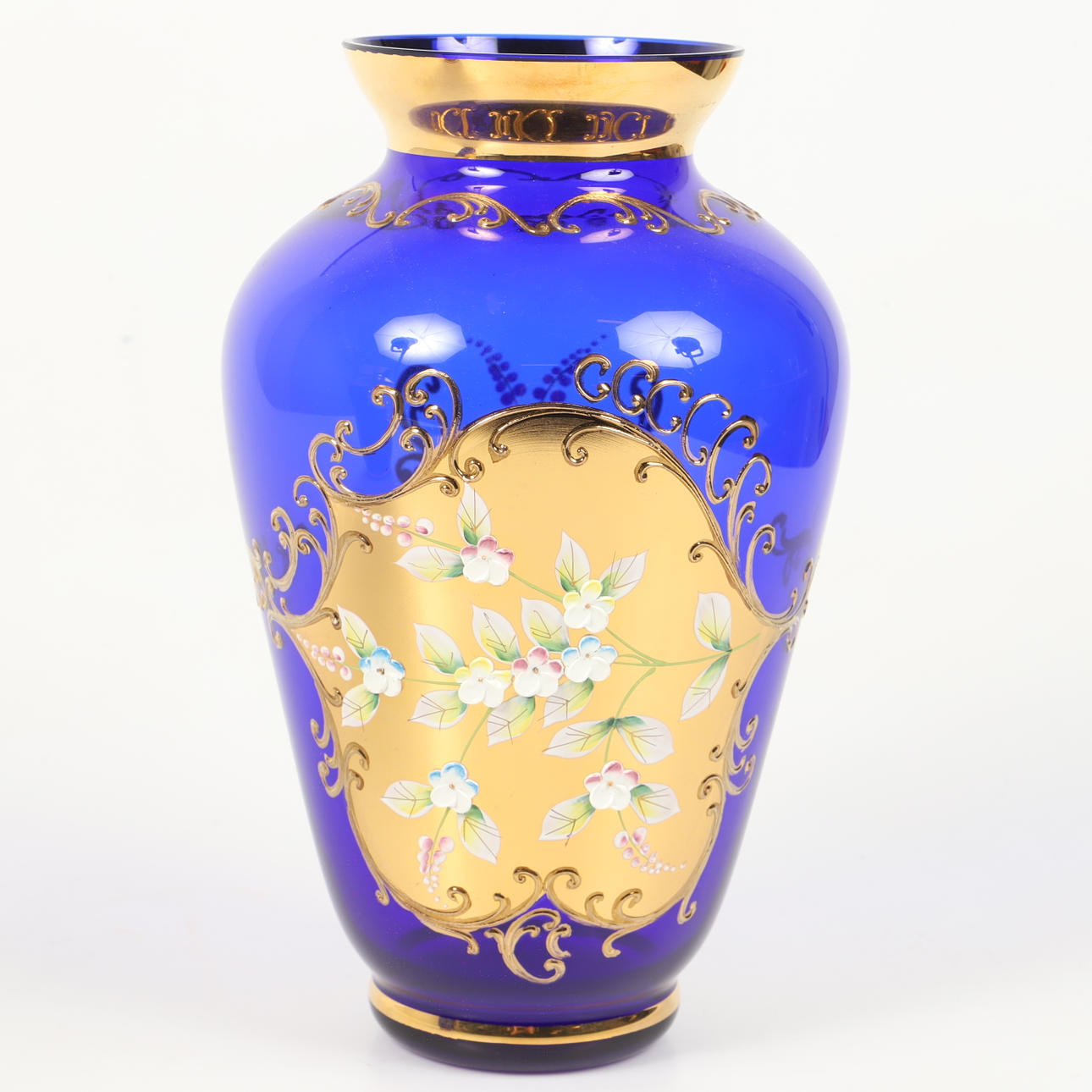 2 jarrones similares, cristal de color cobalto con decoración floral sobre base dorada Altura 25, diámetro 9-14 cm.