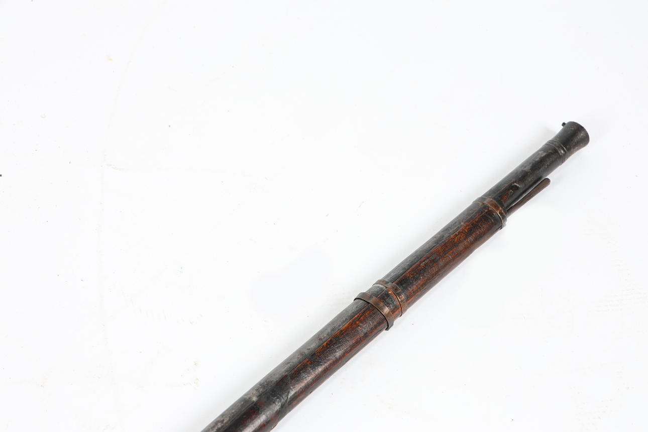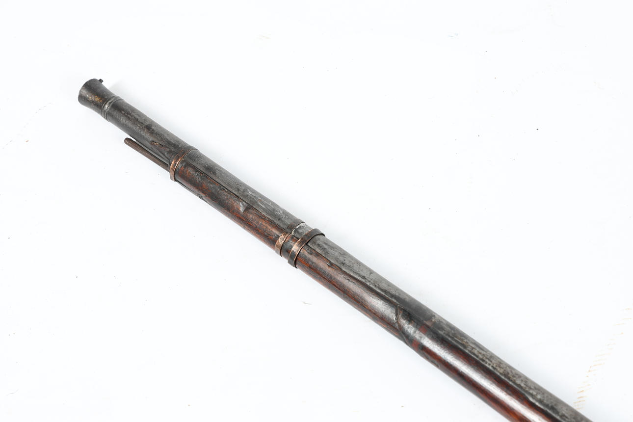 Fusil Jezail Matchlock de la India, cañón de acero con extremo ligeramente acampanado, mecanismo de cerilla con puntas, gatillo ranurado, culata delantera delgada con bandas de cobre, cañón estampado «JPR/FXR/2/7473», culata trasera estampada «3304», longitud total 174 cm.