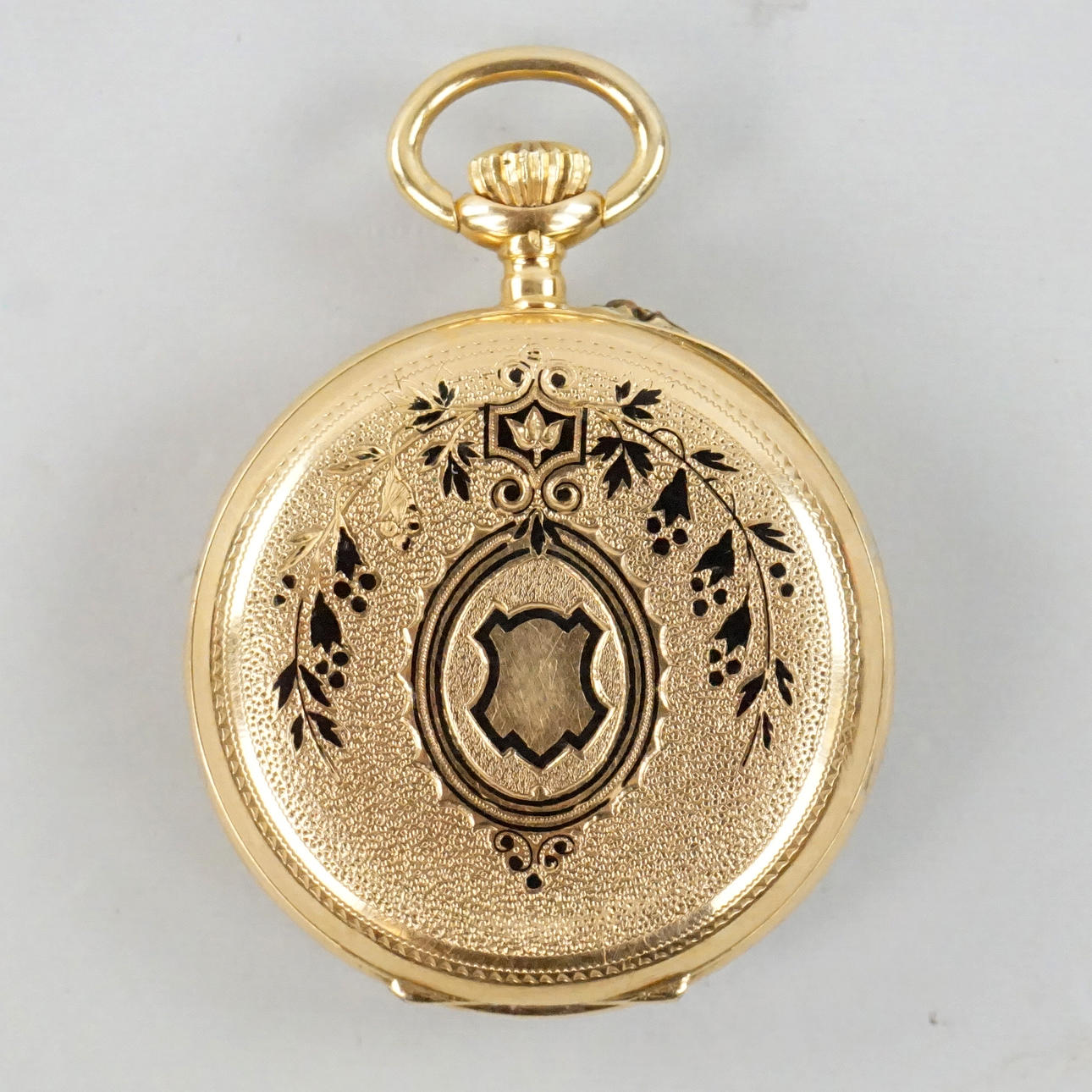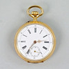 Reloj de bolsillo, caja de oro de 18 quilates, tapa interior de metal. Diámetro 3,5 cm. Etiquetado «Remontoir», «Ancre Ligne Droite», «Balancier Compense», «Spiral Breguet»., 15 Rubis,