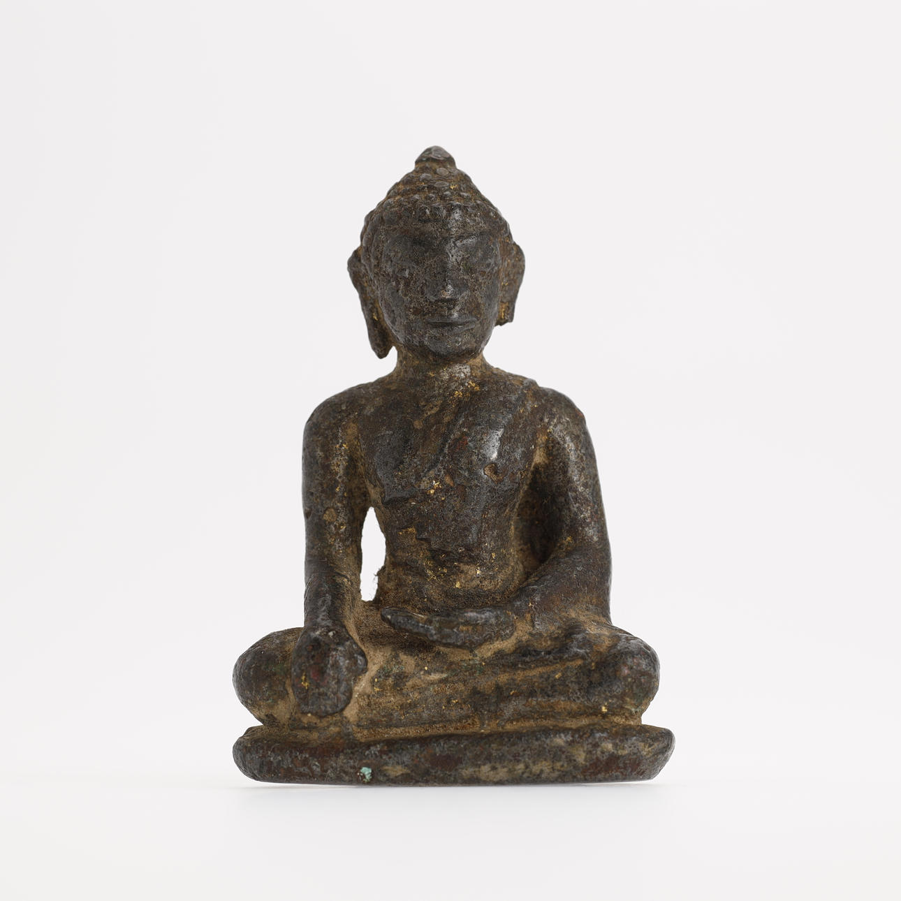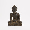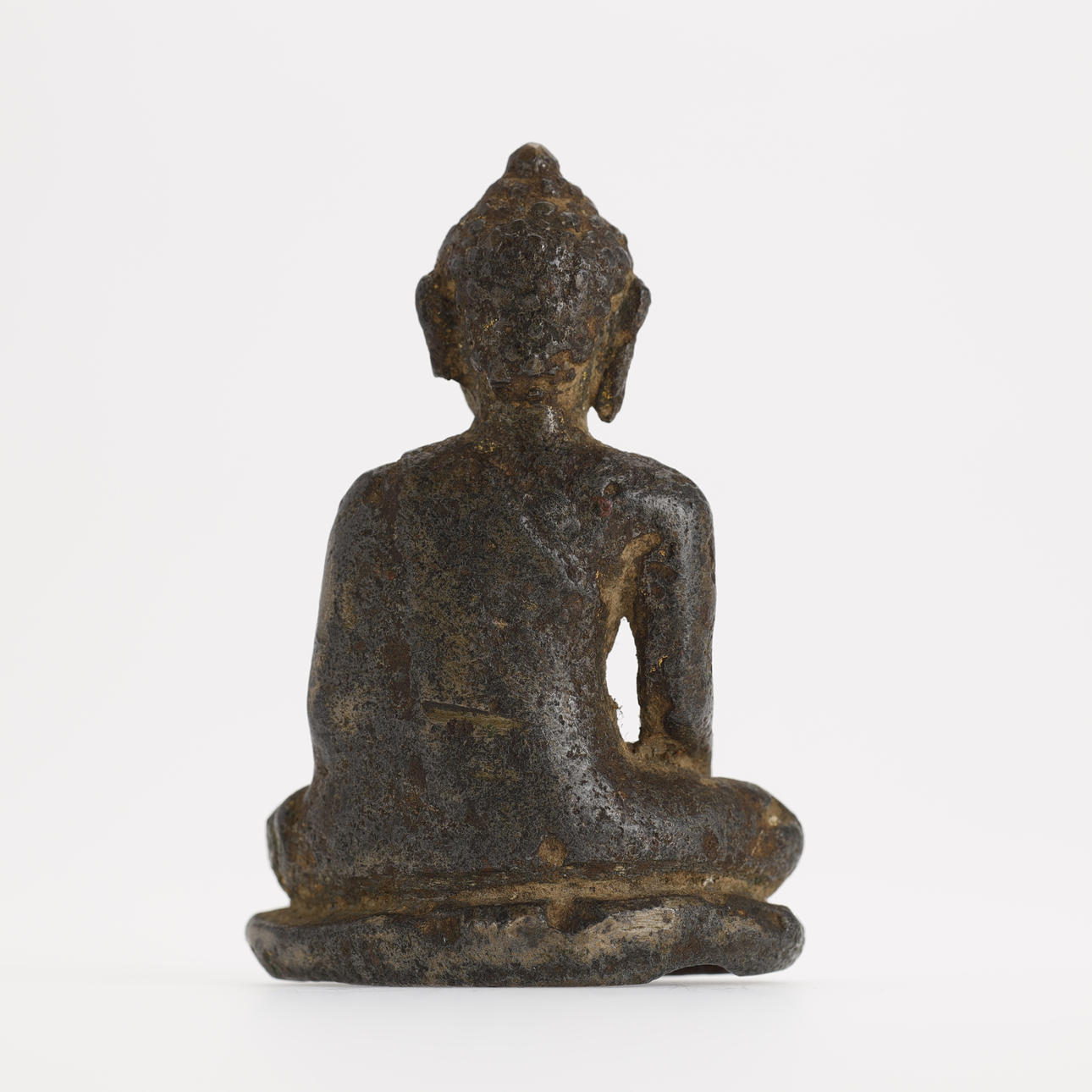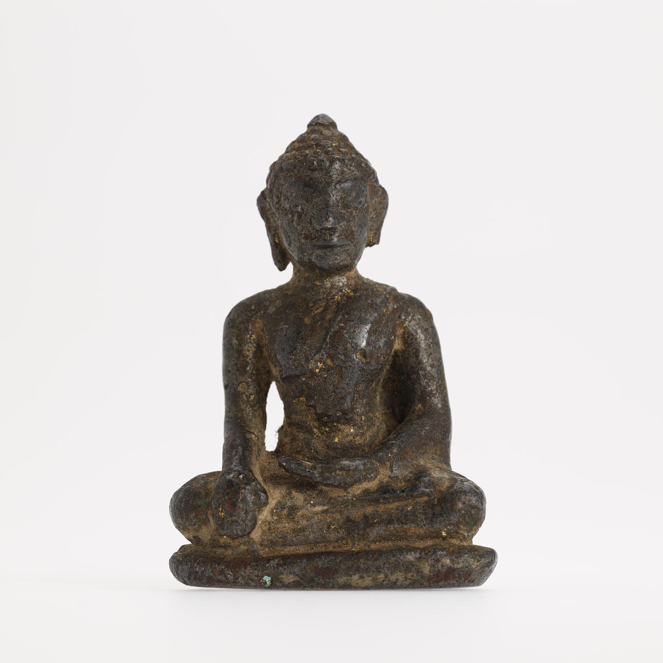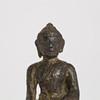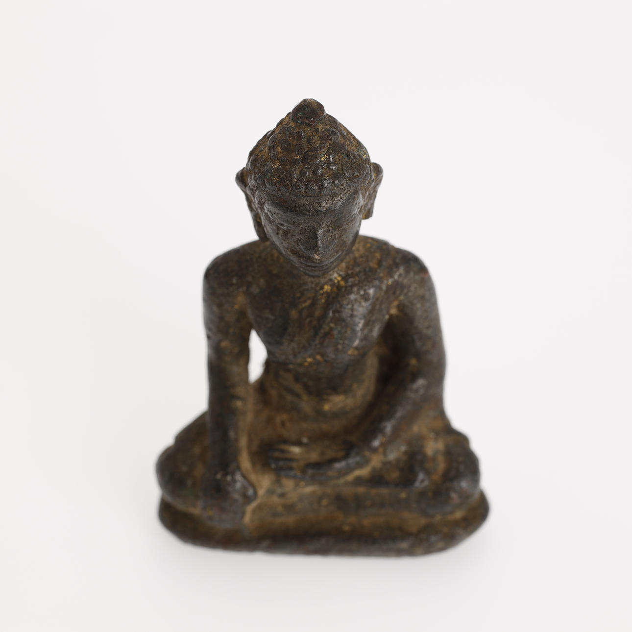 Buda sentado en Virasana en bhumisparsa mudra en un trono bajo.