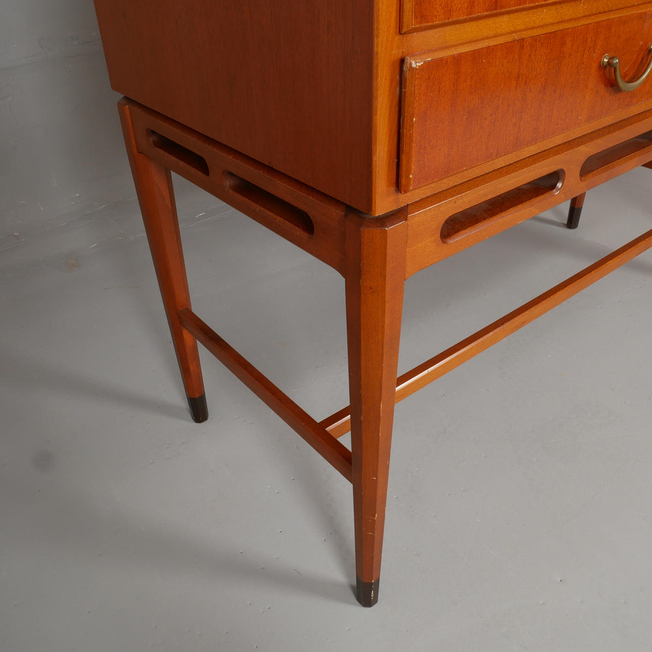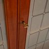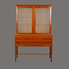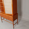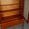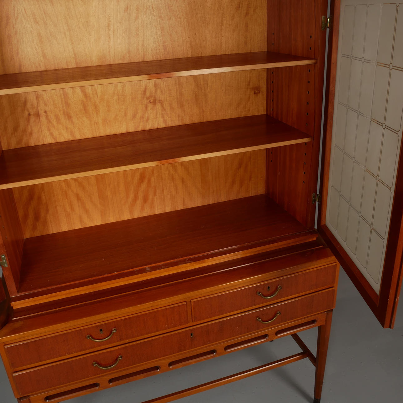 Diseñador no identificado. Puertas de armario de caoba con vidrio grabado mate con decoración de rejilla. Dos estantes traseros extraíbles sobre soportes de latón. Parte inferior con 3 cajones con cerradura. .Ancho 114 cm, profundidad 48 cm, altura 170 cm.