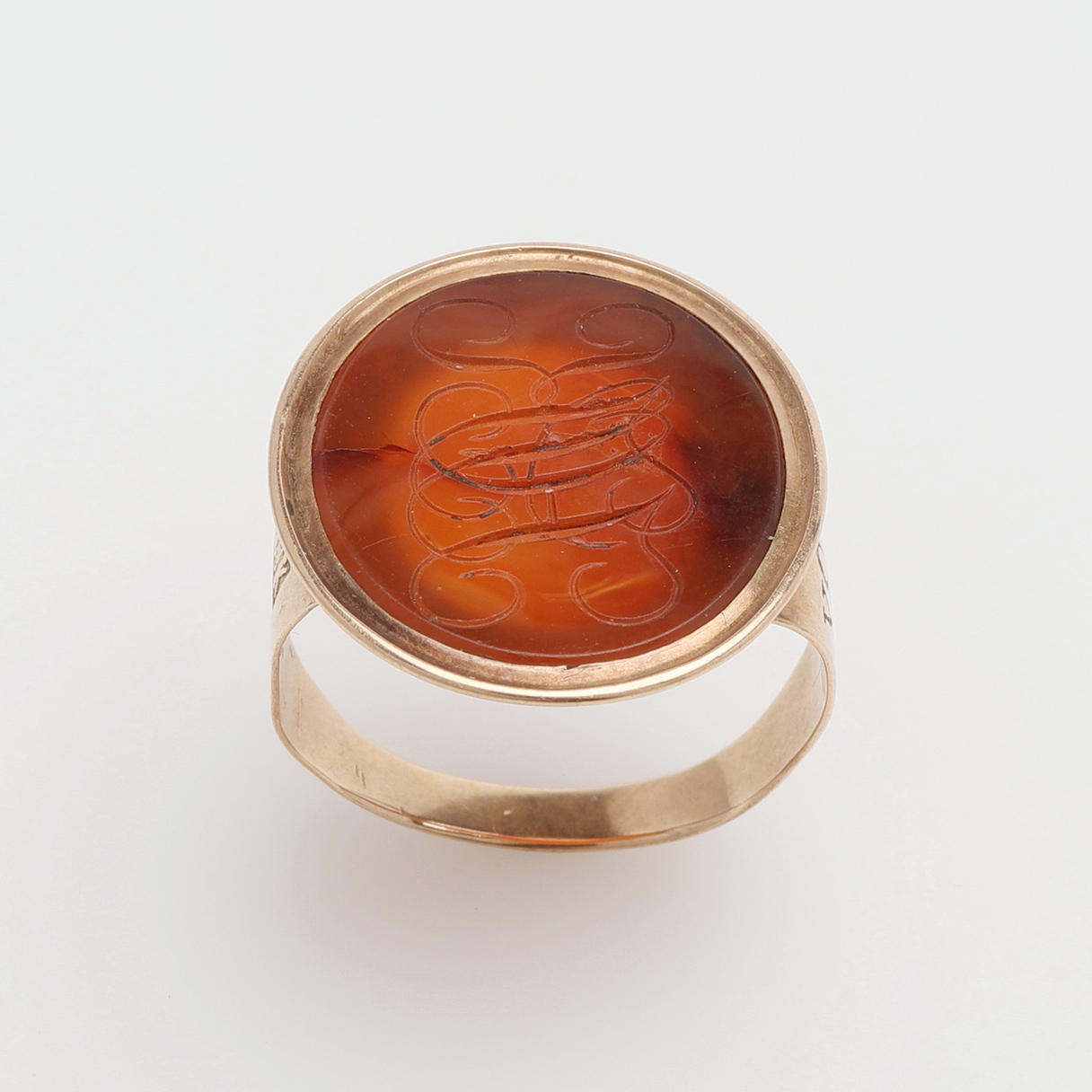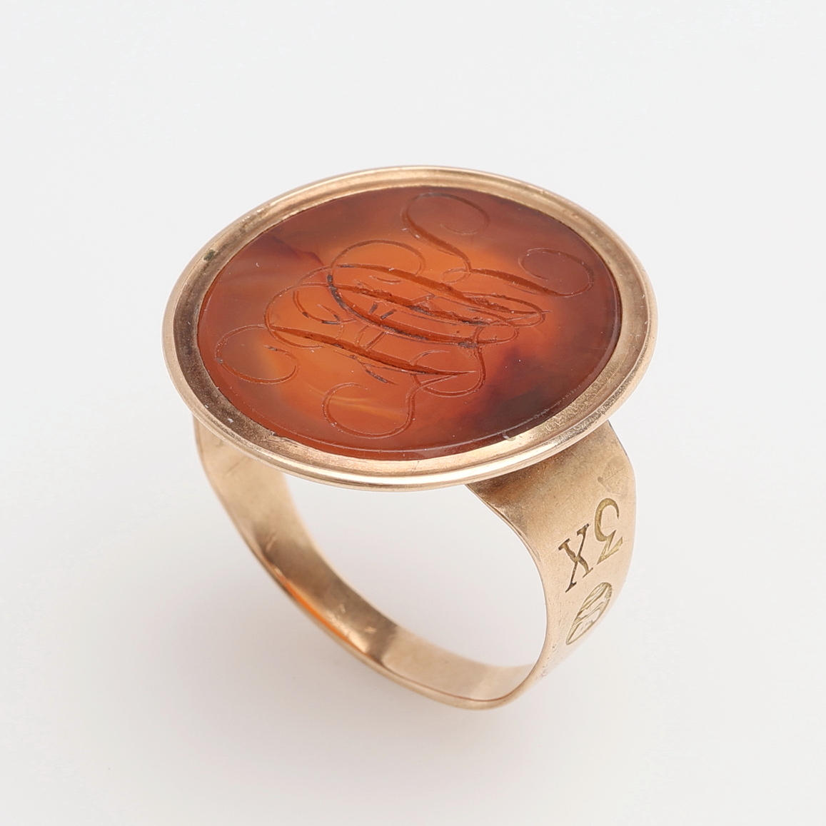 Oro de 18 quilates con cornalina grabada en monograma, sellada Simrishamn 1828 (Ramberg estuvo activo en Simrishamn -1822-1859-), talla 19 3/4, peso 7,9 gramos.