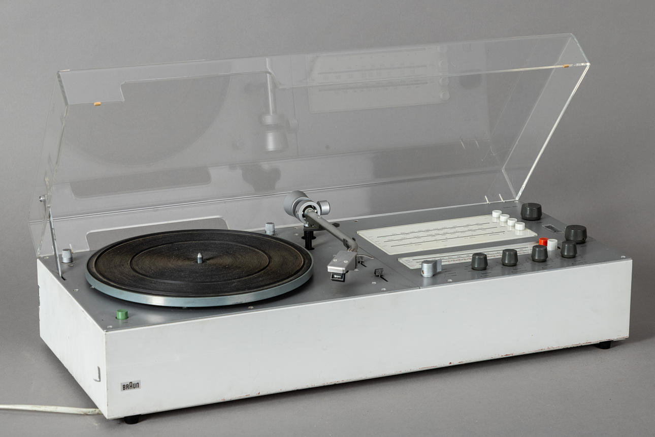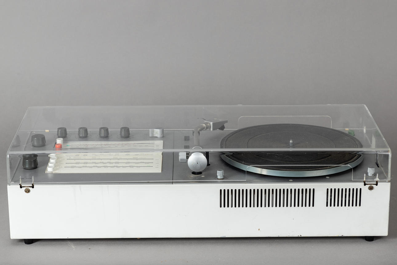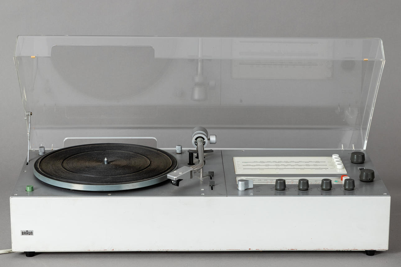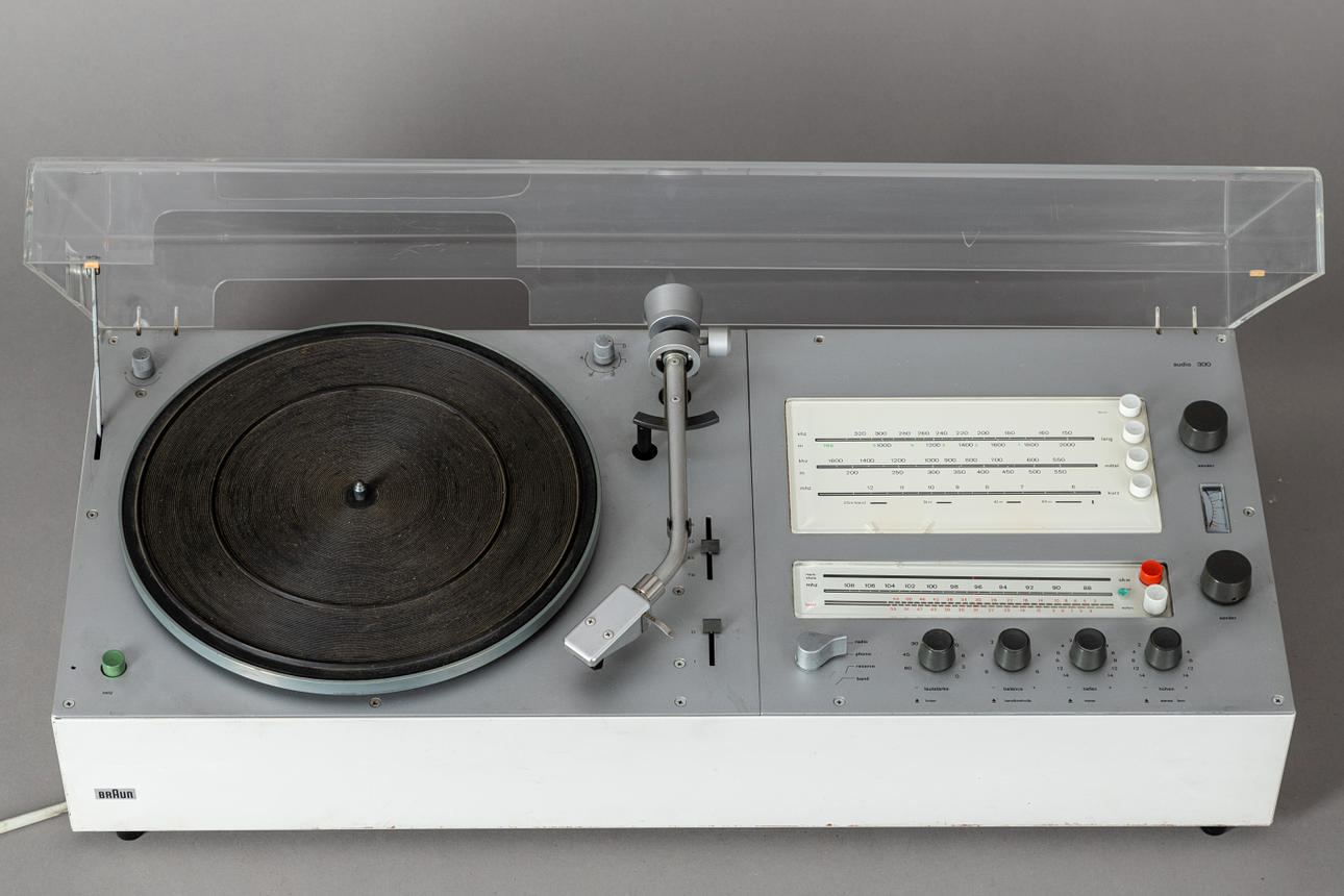Sistema compacto/tocadiscos 'Audio 300' de Dieter Rams para Braun. Años de construcción: 1969 - 1973, fabricado en Alemania. Sistema compacto compuesto por tocadiscos, receptor de radio y amplificador.
