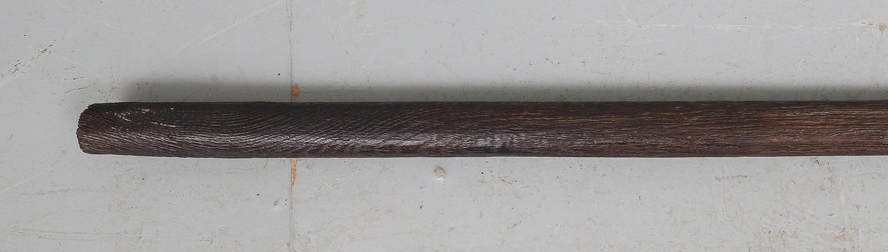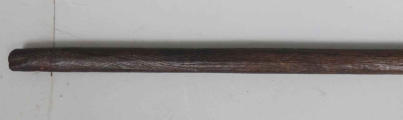 un eje de madera, granulado y parcialmente tachonado, una cabeza de hacha de hierro barbuda que se puede quitar del eje, 114 cm de altura.