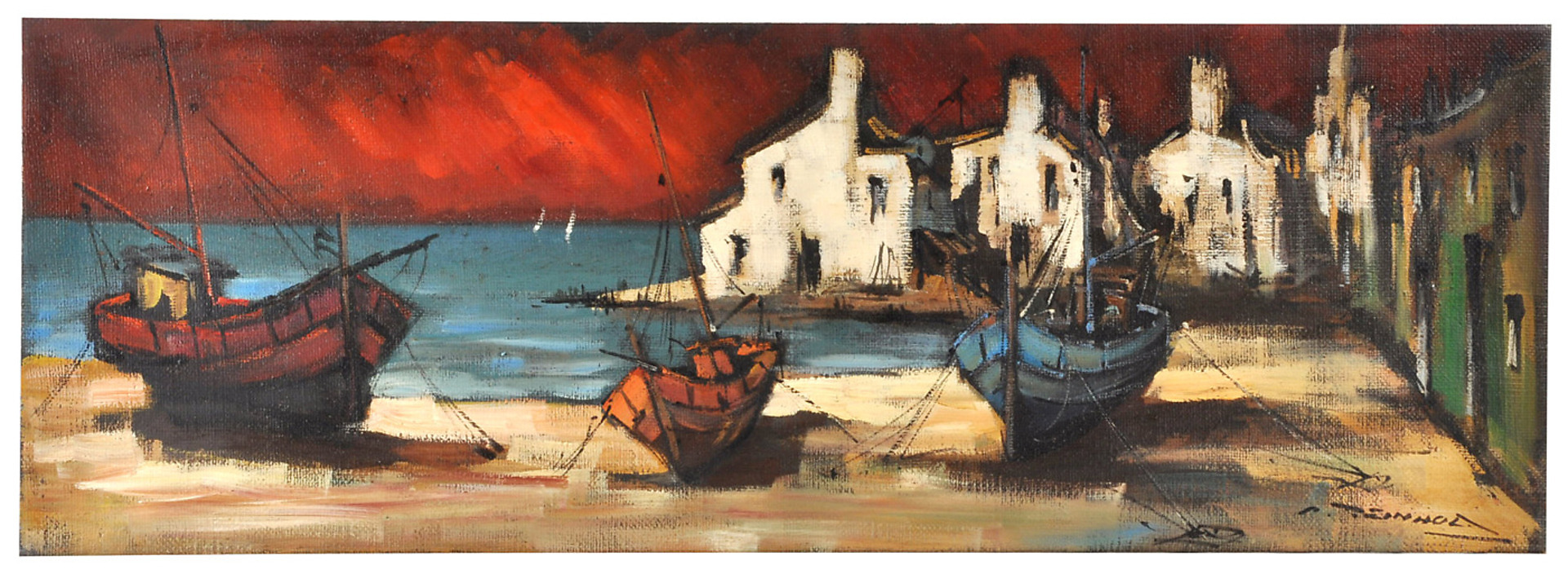 330451. SIGNIERT REINHOLD. Costa mediterránea con edificios y barcos.