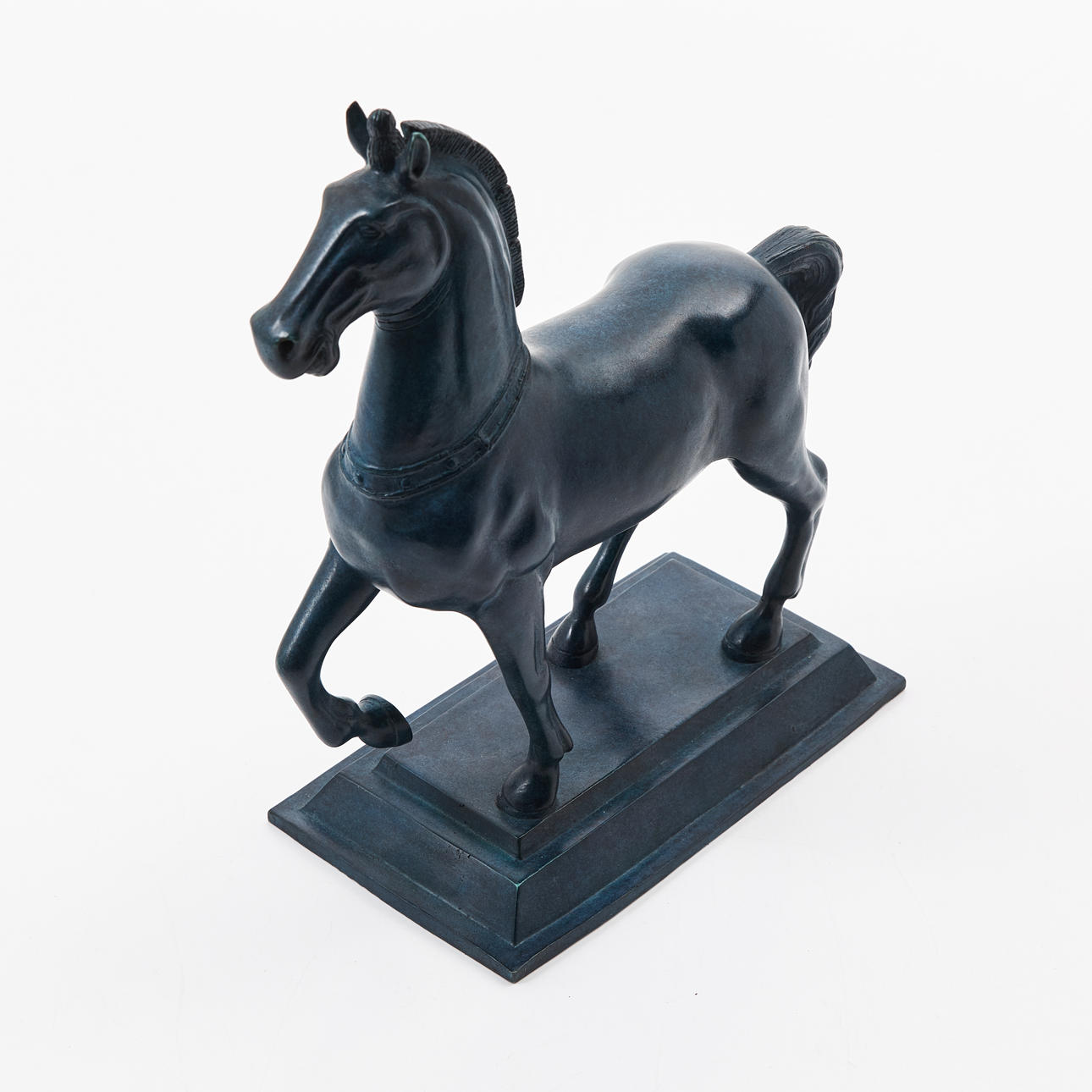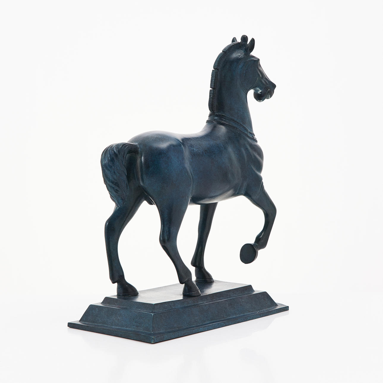 HISTORIA: Basada en el modelo del Blasieholmstorg de Estocolmo, una escultura de bronce más grande de un caballo bizantino basada en «Los caballos bizantinos» en la plaza de San Marcos de Venecia, que data del 300 a. C. hasta 300 d.C. y llegó en el siglo XIII de Constantinopla a Venecia. Este tipo de modelo, también llamado «Handelsbankshästen», se regaló después de un largo y fiel servicio en Handelsbanken.