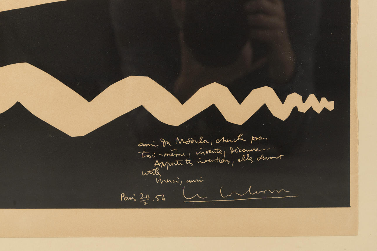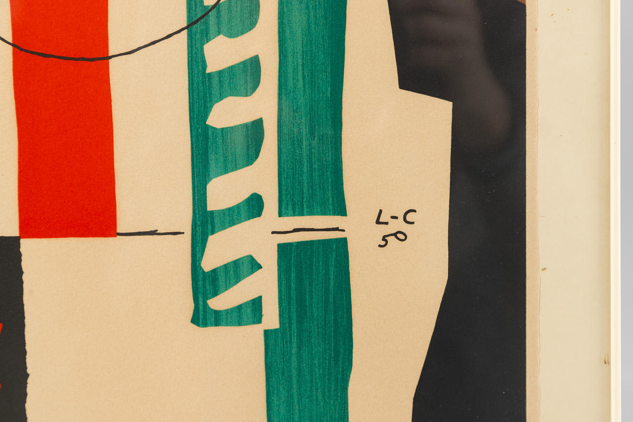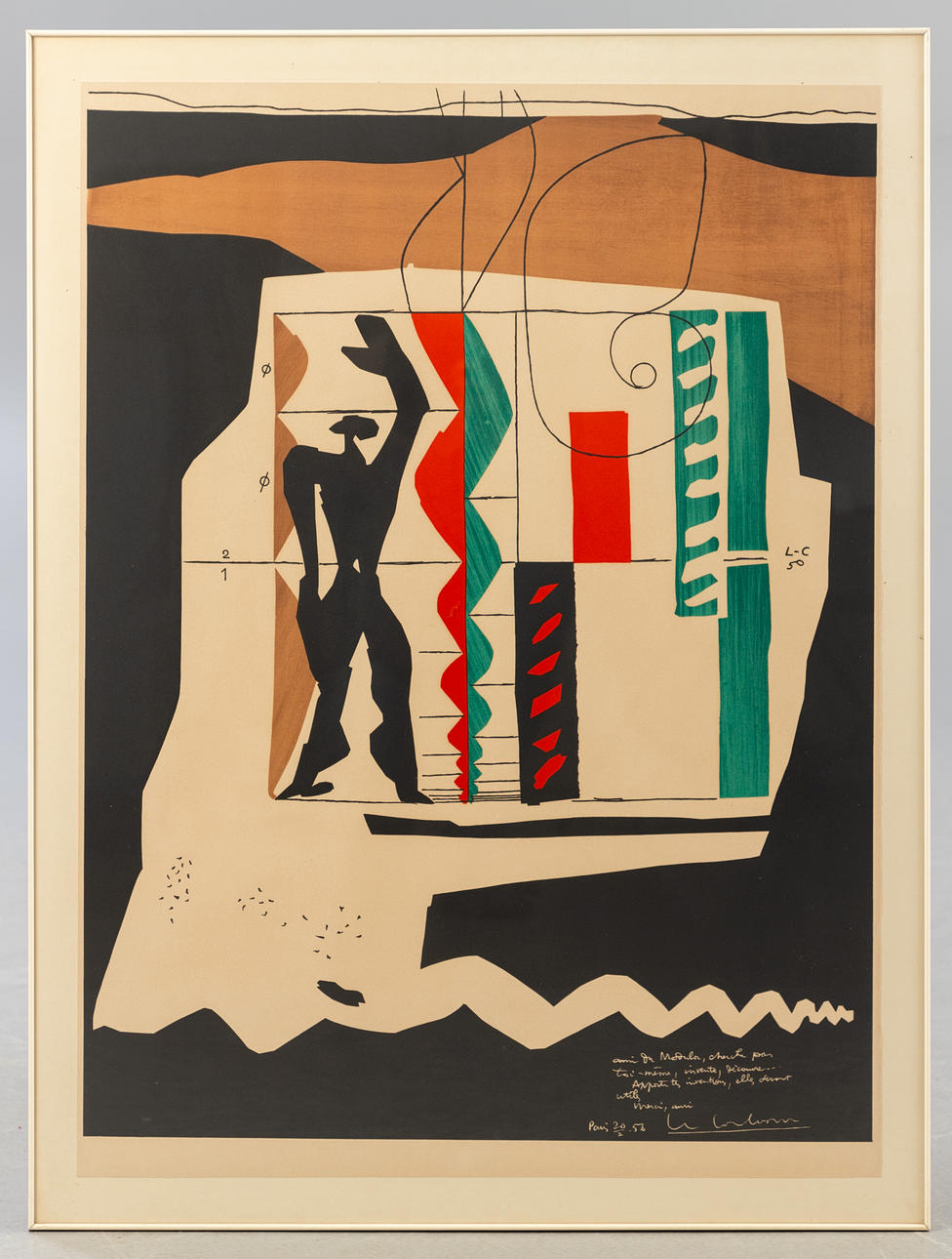Le Corbusier (1887-1965), L'ami du Modulor, litografía en color, 1956, firmada en la parte inferior derecha de la piedra, fechada «París 20/2.56» y titulada «ami du modulor,...», monogramada y fechada de nuevo en la sección central, aquí «L C 50", ca. 73,5 x 54 cm (tamaño de hoja), enmarcado detrás de un cristal, ca. 80,5 x 60,5 cm.