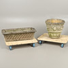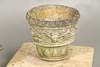 La maceta con forma de abrevadero Belton está decorada en relieve con un patrón de celosía tejida en cesto (26 cm de alto x 88 cm de largo x 39 cm de profundidad), junto con una maceta redonda, decorada en relieve con una máscara, una hoja y otros diseños. 47 cm de altura x 55,5 cm de diámetro. (2).