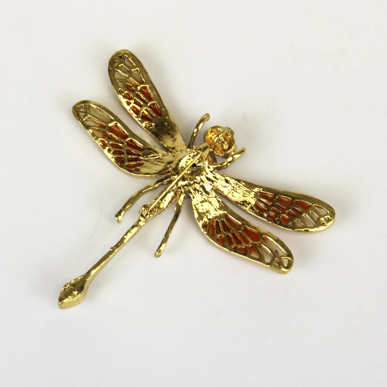 Broche con forma de libélula engastado en piedras doradas, 8 cm de largo.
