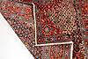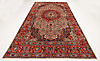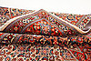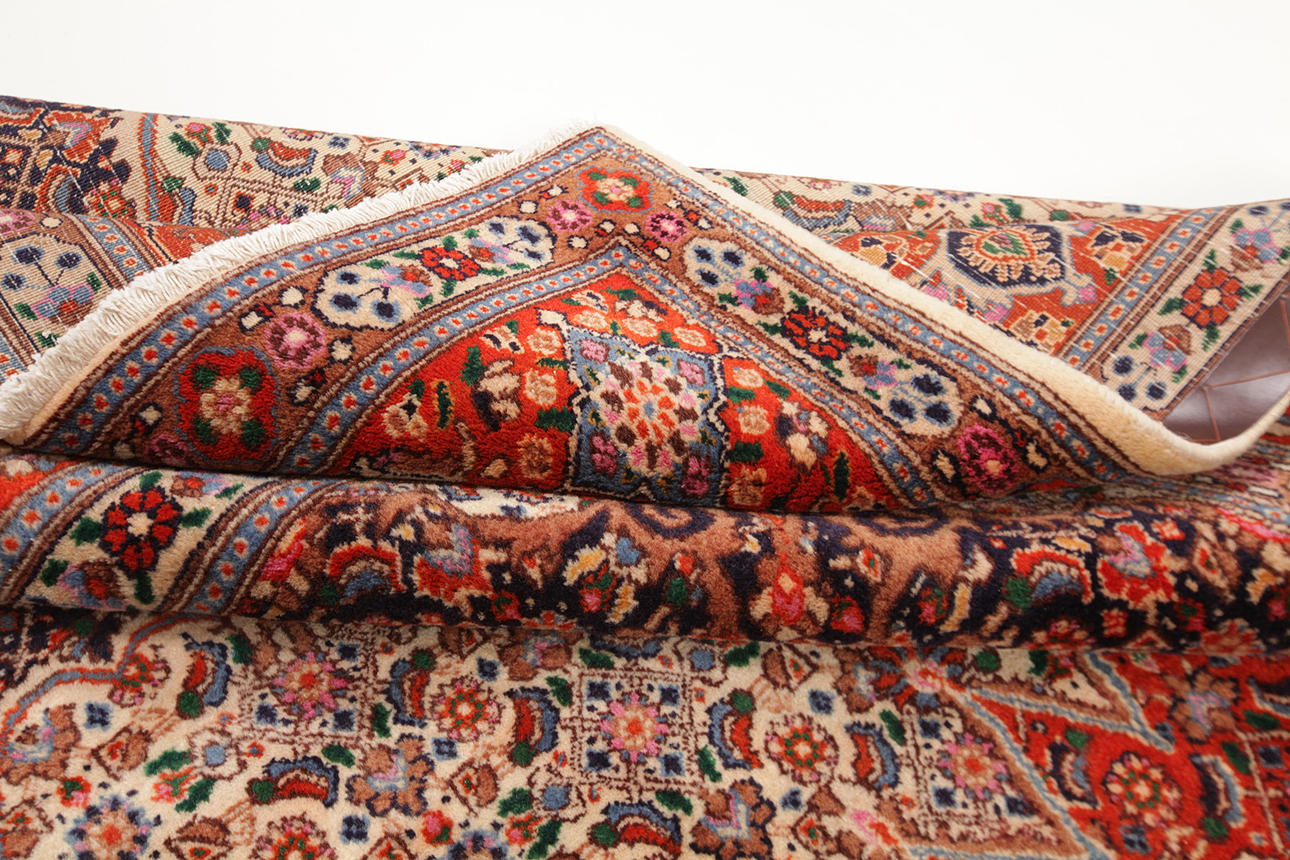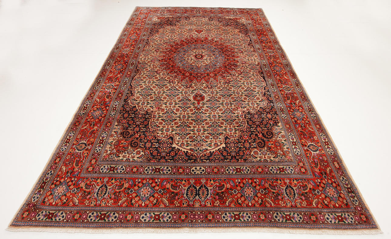 Alfombra de lana de la provincia de Khorasan Motivo con medallón en forma de estrella sobre fondo beige Motivo estilizado de flores Borde de cabeza con fondo rojo.