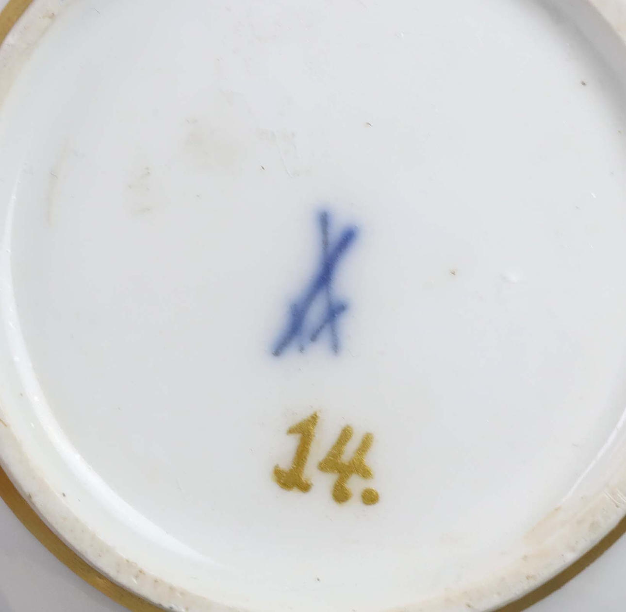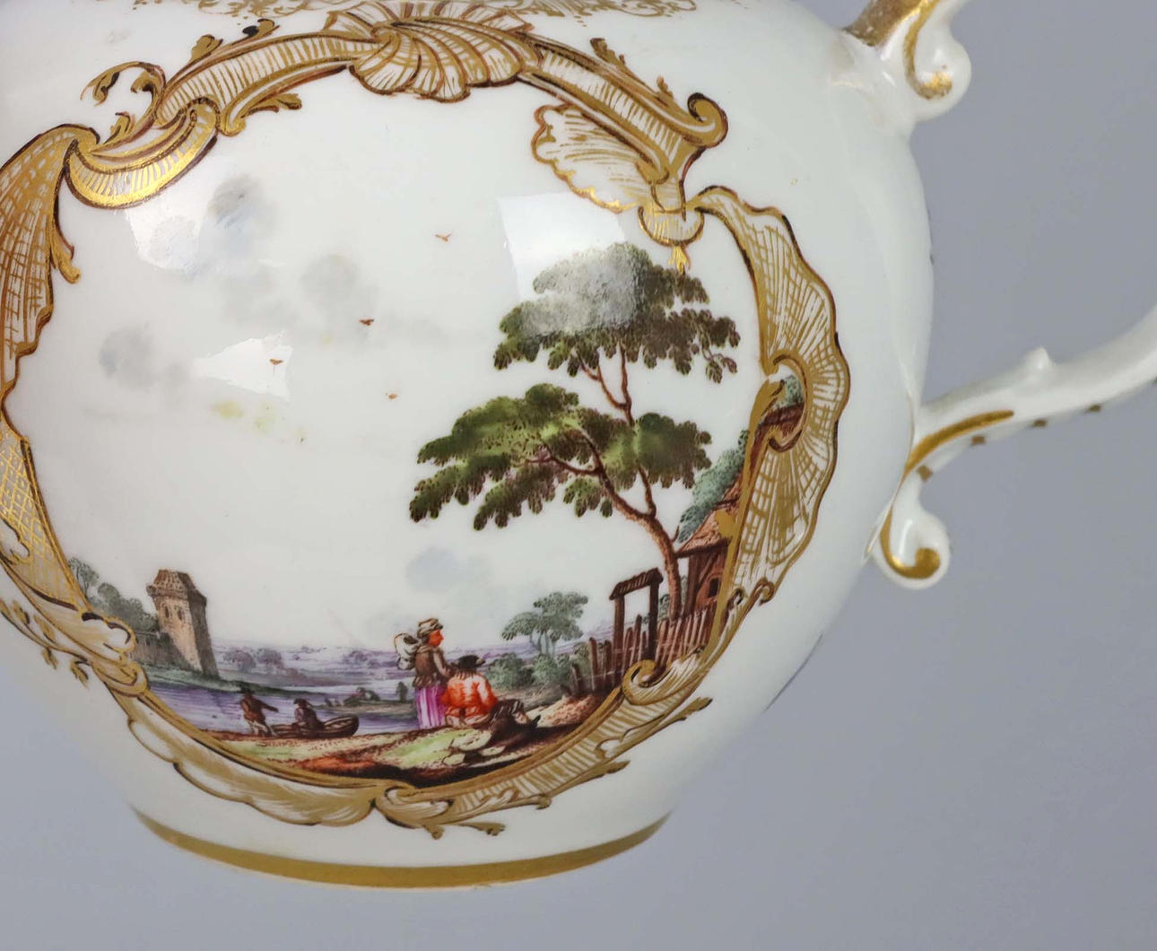 Porcelana con marca de espada azul esmaltada de la fábrica de porcelana de Meissen, siglo XVIII Century, pincel dorado no. *14.*, jarra pequeña con mango de hojas de acanto en relieve y vertedor con forma de cabeza de animal (restaurada), tapa plana con pomo en forma de flor (ligeramente dañada), ambos lados con fina pintura a mano en un marco decorativo dorado, Christian Friedrich Herold (*1700 †1779), h ca. 10 cm.
