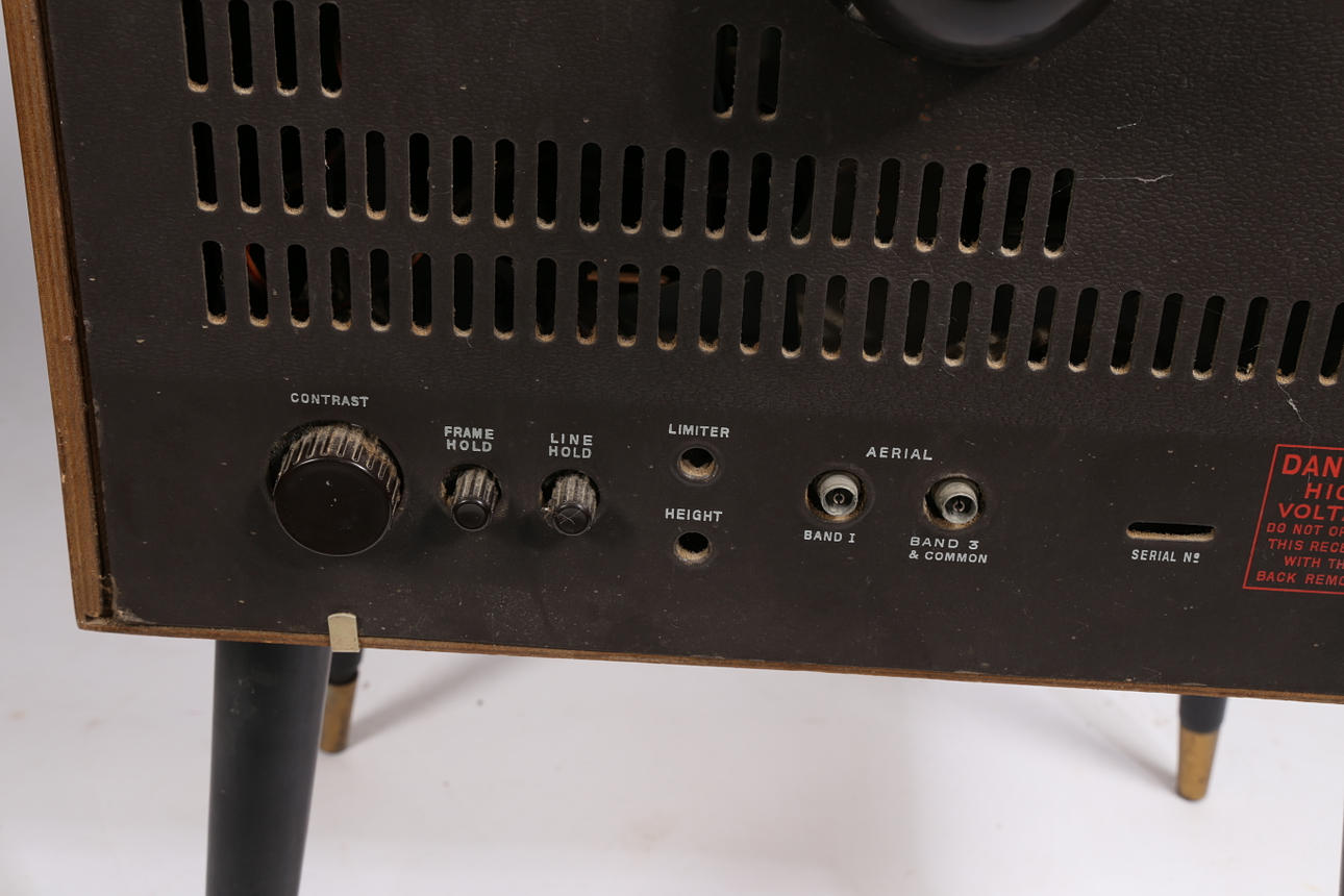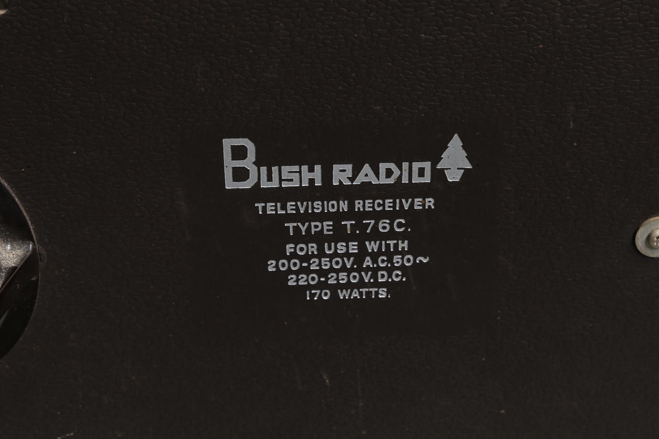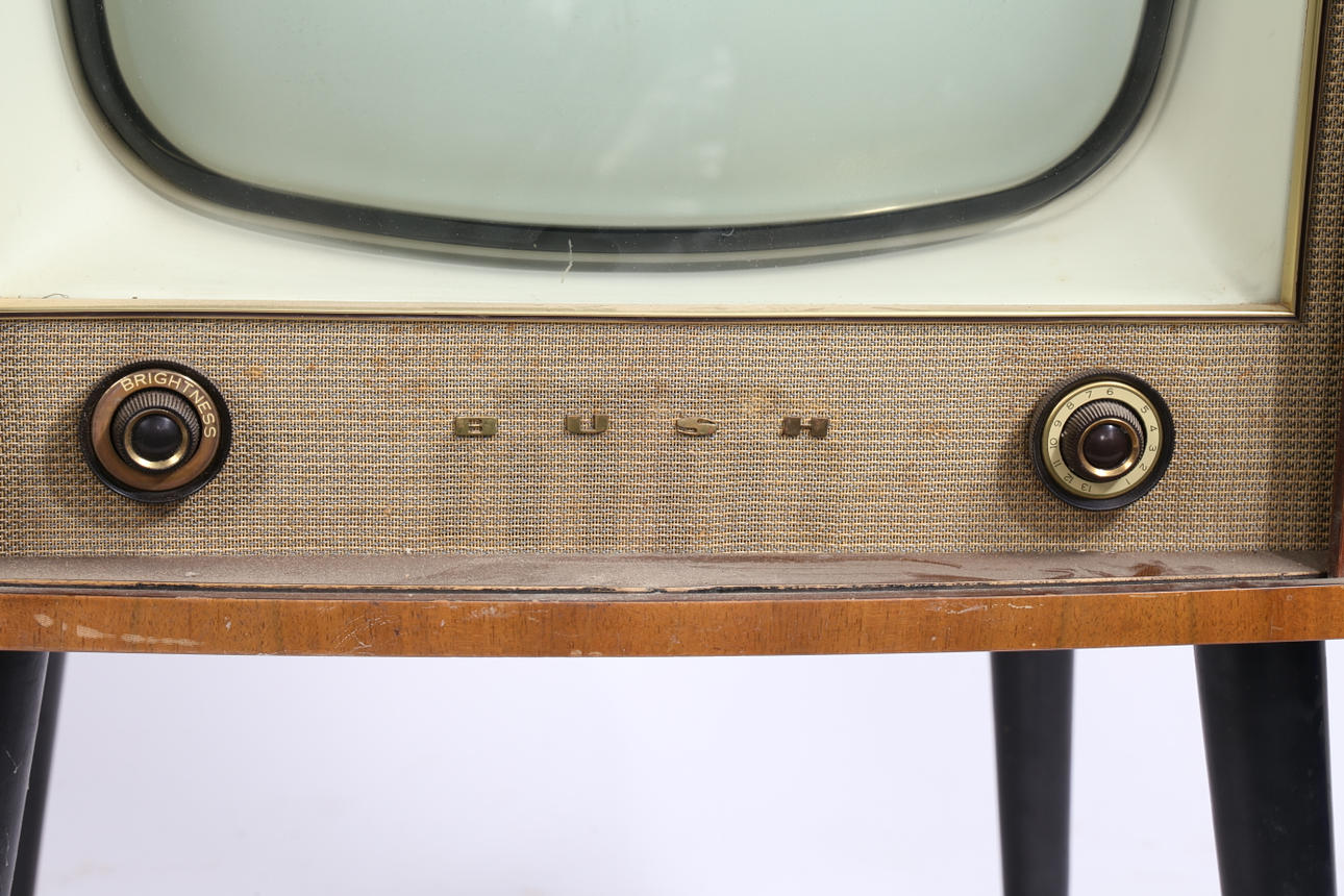 Un televisor Bush Radio T.76C. Aprox. Tamaño de pantalla de 15 pulgadas (medida en diagonal), con selector de canales y botones de brillo en la parte delantera y botón de contraste en la parte trasera. En un armario de teca con frente de tambor, levantado sobre patas pintadas de negro con férulas de latón. Dimensiones totales: 88 cm de altura, 57 cm de ancho, 43 cm de profundidad.