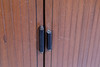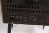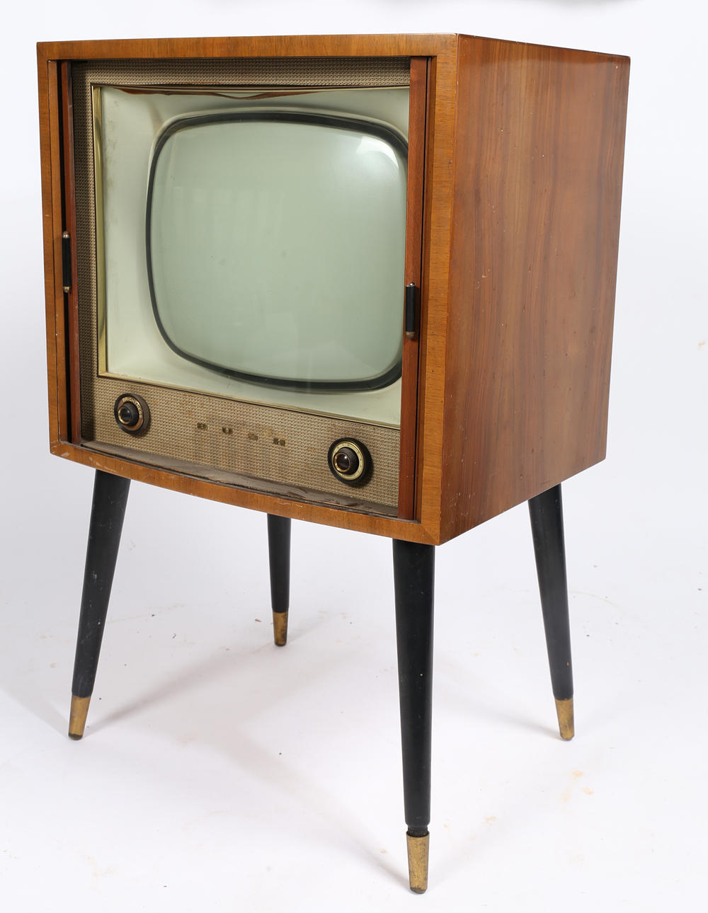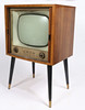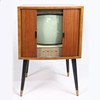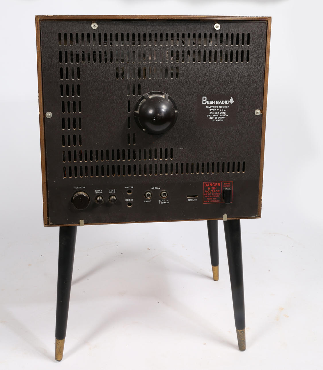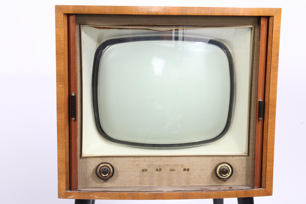 Un televisor Bush Radio T.76C. Aprox. Tamaño de pantalla de 15 pulgadas (medida en diagonal), con selector de canales y botones de brillo en la parte delantera y botón de contraste en la parte trasera. En un armario de teca con frente de tambor, levantado sobre patas pintadas de negro con férulas de latón. Dimensiones totales: 88 cm de altura, 57 cm de ancho, 43 cm de profundidad.