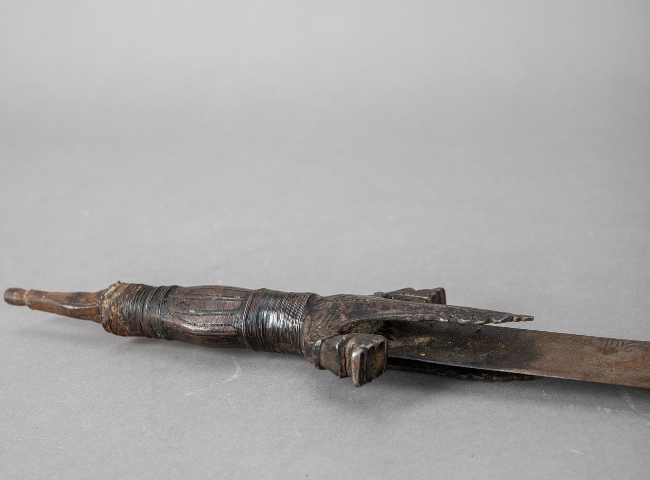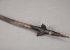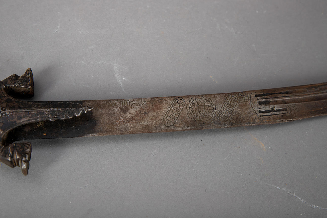 Este jersey de un solo filo es típicamente curvo, está decorado con inscripciones en la hoja y tiene un protector decorativo. Falta la perilla habitual en el extremo del mango decorada con bandas de hierro.