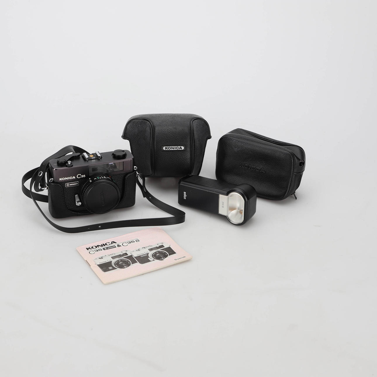 Cámara Konicac35 con bolsa de flash y manual de instrucciones.