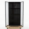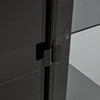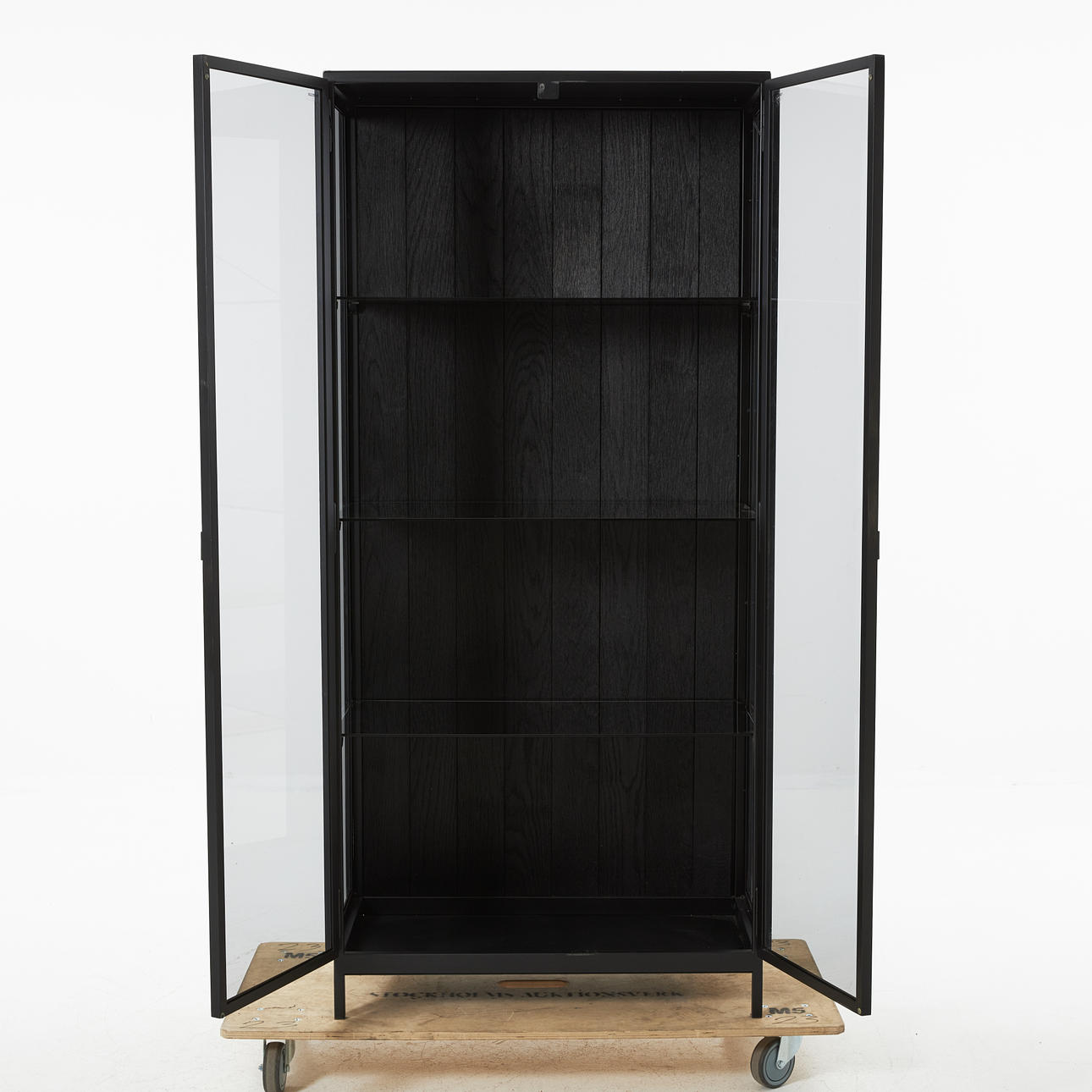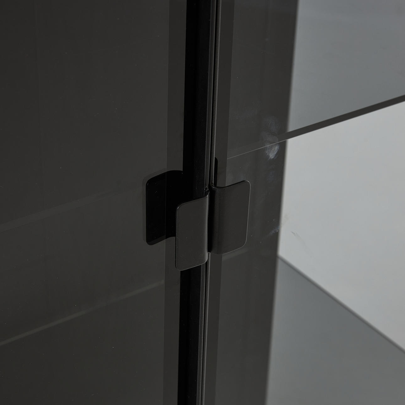 Estructura de metal negro, puertas y laterales de vidrio semiopaco, tres estantes, dimensiones aproximadas de 180,87x45 cm.
