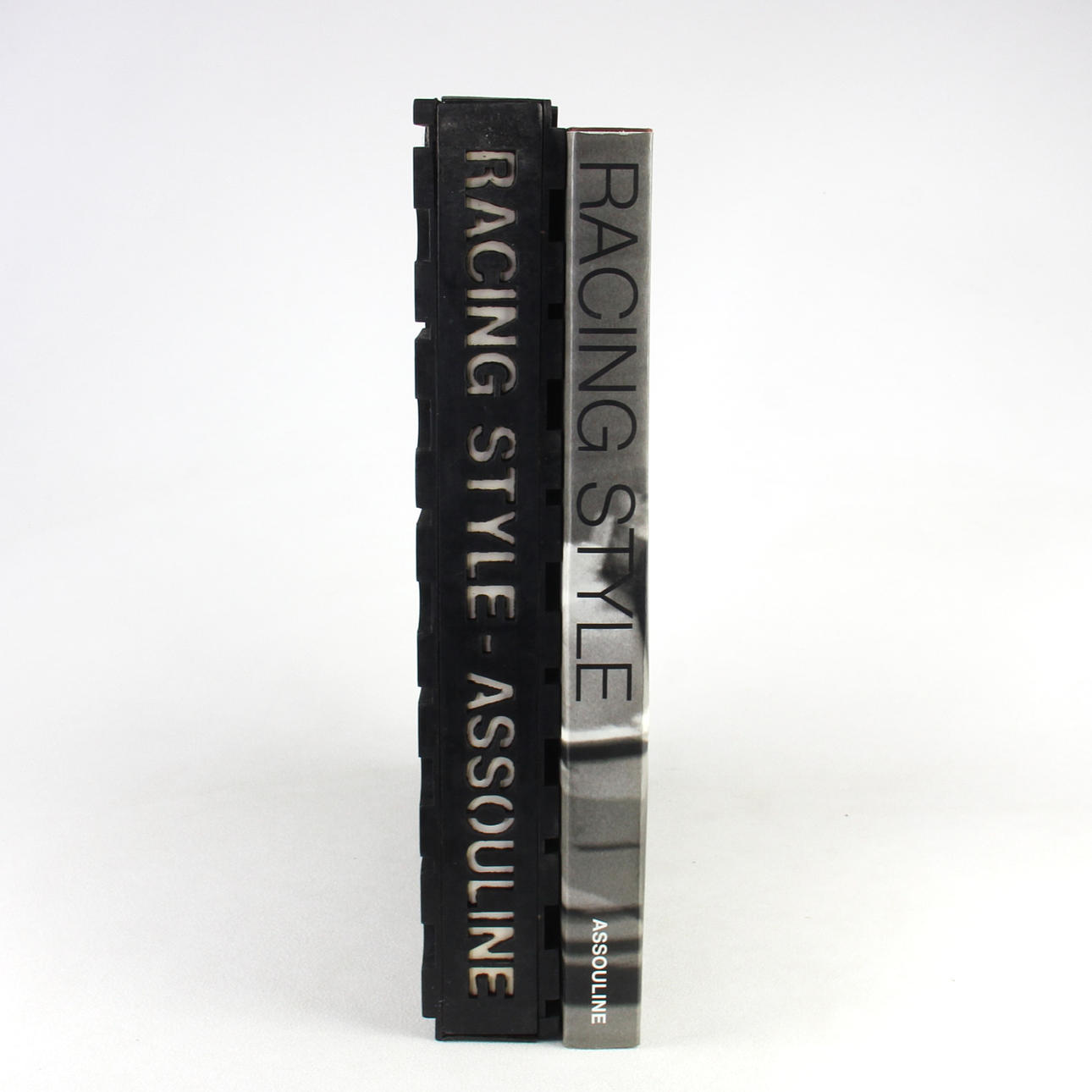 Una copia en tapa dura de edición especial de Racing Style de Assouline con un estuche con diseño de neumáticos.