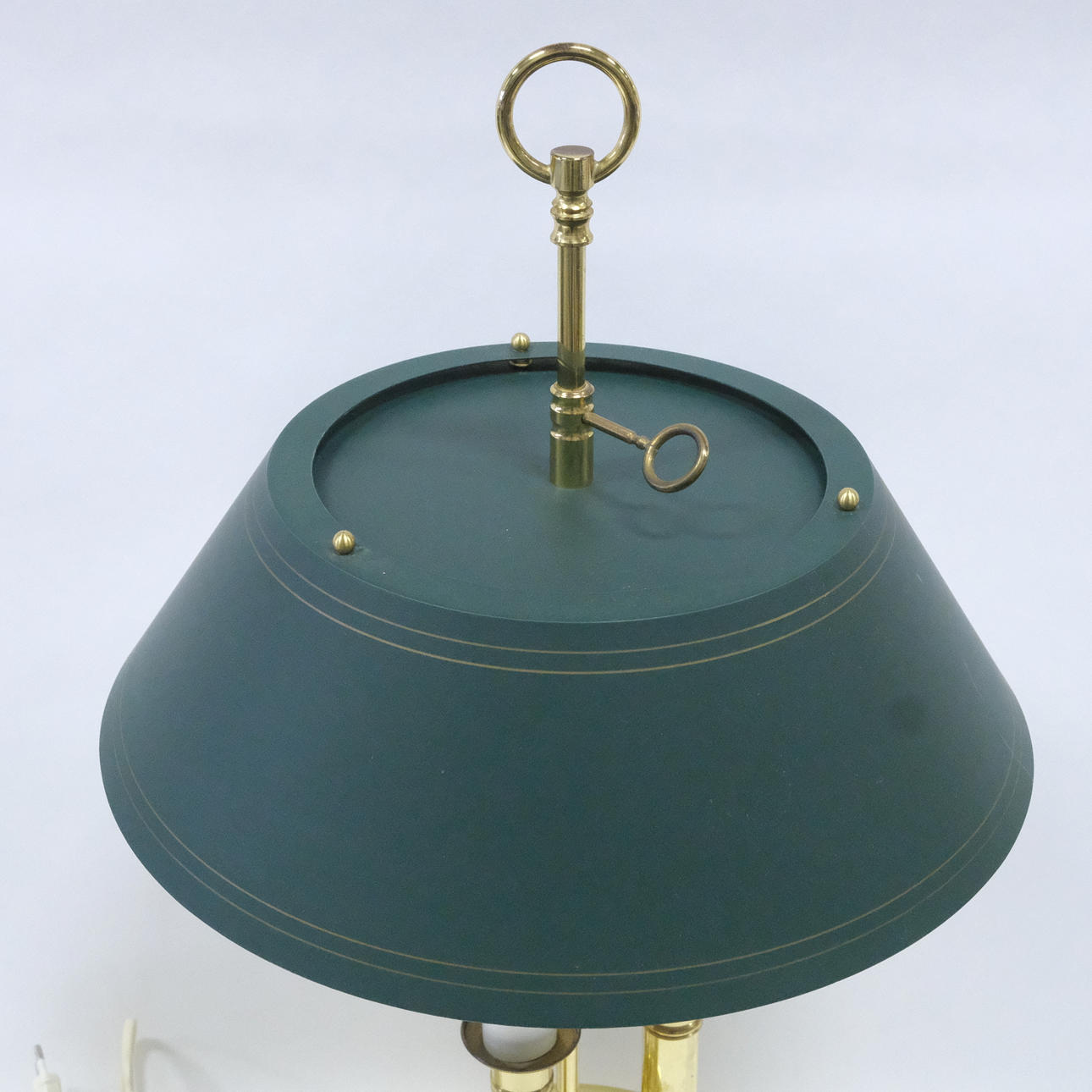 Latón y chapa, pantalla regulable en altura, tres fuentes de luz, altura 62 cm, marcada ÖIA.