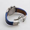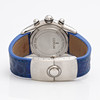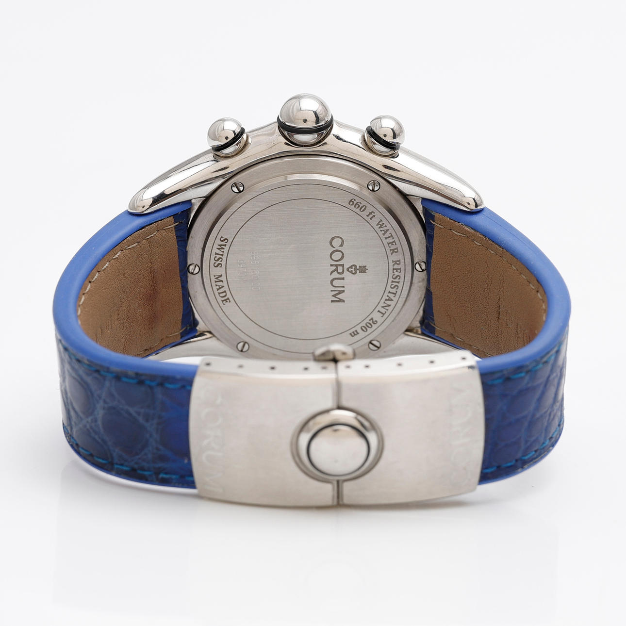 Caja en acero con 44 mm de diámetro. Esfera azul e índices luminiscentes. Calendario y segundero a las seis. Función cronógrafo. Movimiento cuarzo. Correa de cuero con cierre desplegable doble oculto. Cristal abombado estilo Corum.