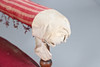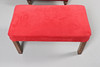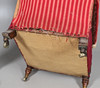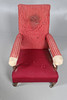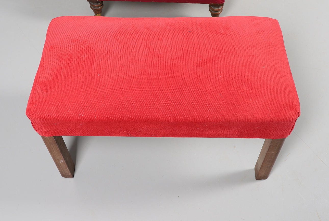 sobre patas delanteras torneadas y ruedas de latón, 83 cm de alto x 63 cm de ancho; junto con un taburete de caoba con tela roja, 44 cm de alto x 74 cm de ancho.