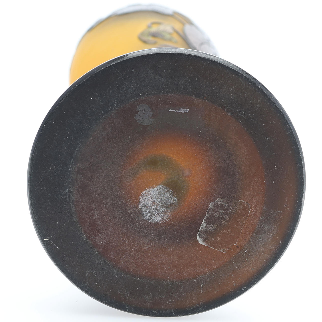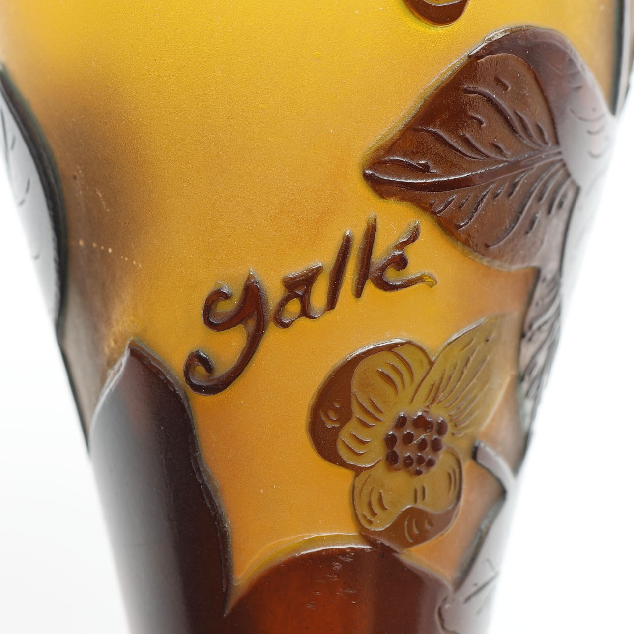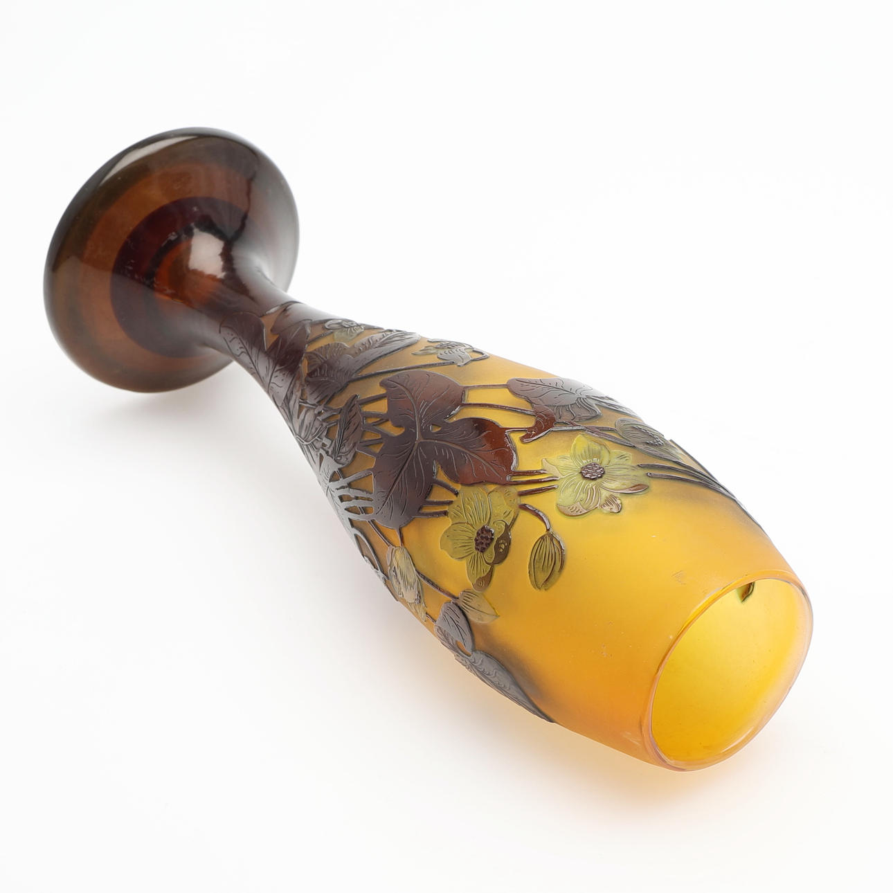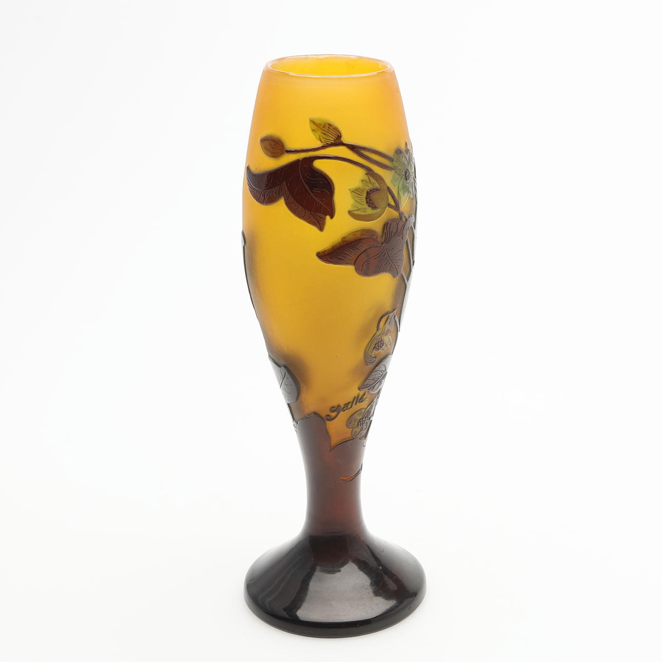 Art Nouveau, vidrio voladizo en naranja, verde y marrón, con decoración grabada que representa clemátides sobre un fondo iridiscente, firmado «Gallé», Francia, primera mitad del siglo XX, altura 24,2 cm.