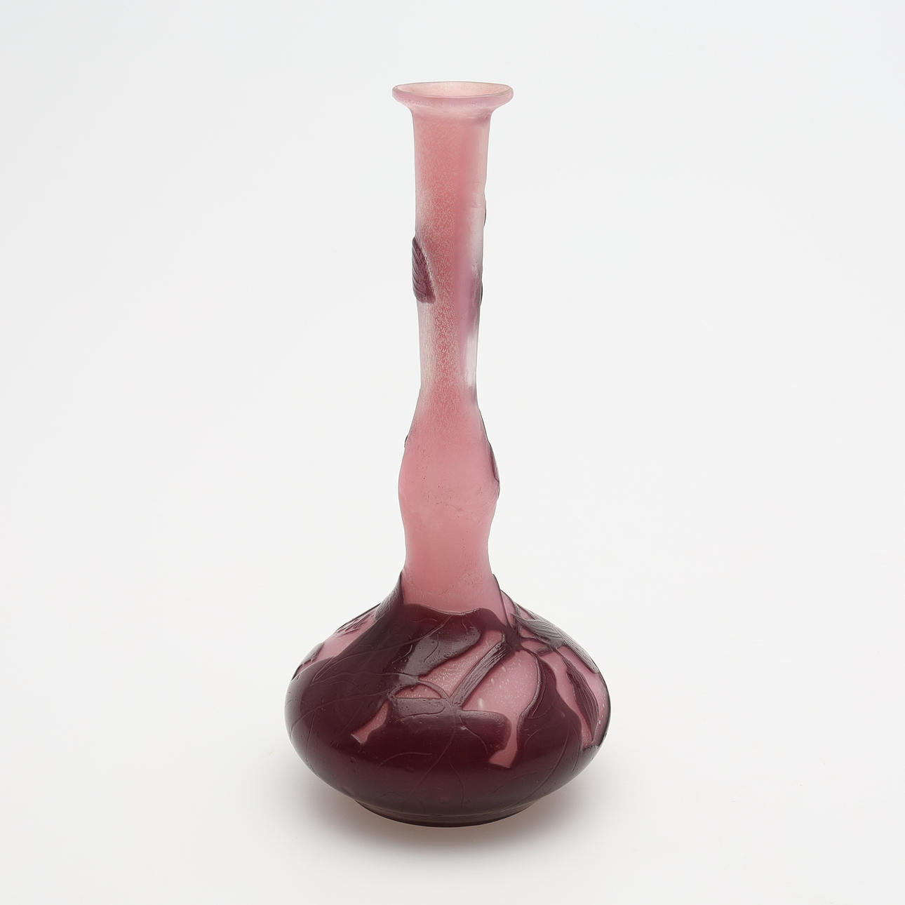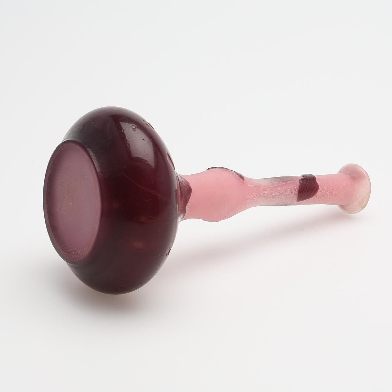 Vidrio en voladizo estilo Art Nouveau, solifleur, en rosa y burdeos con decoración grabada que representa el fucsia, firmado «Gallé», Francia, primera mitad del siglo XX, altura 16,5 cm.