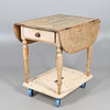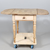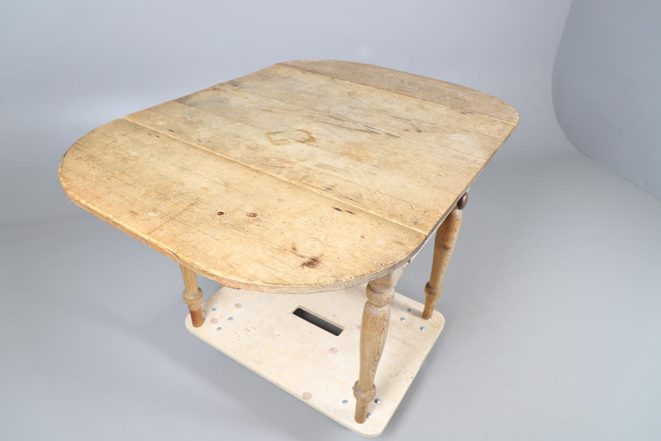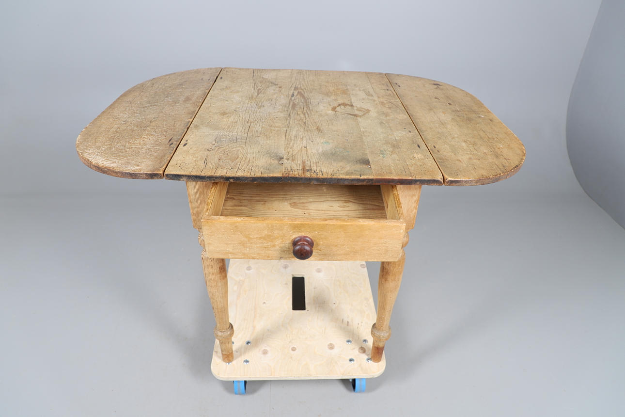 Con un solo cajón en cada extremo y solapas abatibles con bordes redondeados a cada lado, se apoyaba sobre patas torneadas. 77 cm de alto x 87 cm de largo x 67 cm de ancho. Las solapas añaden 29,5 cm a cada lado del ancho.