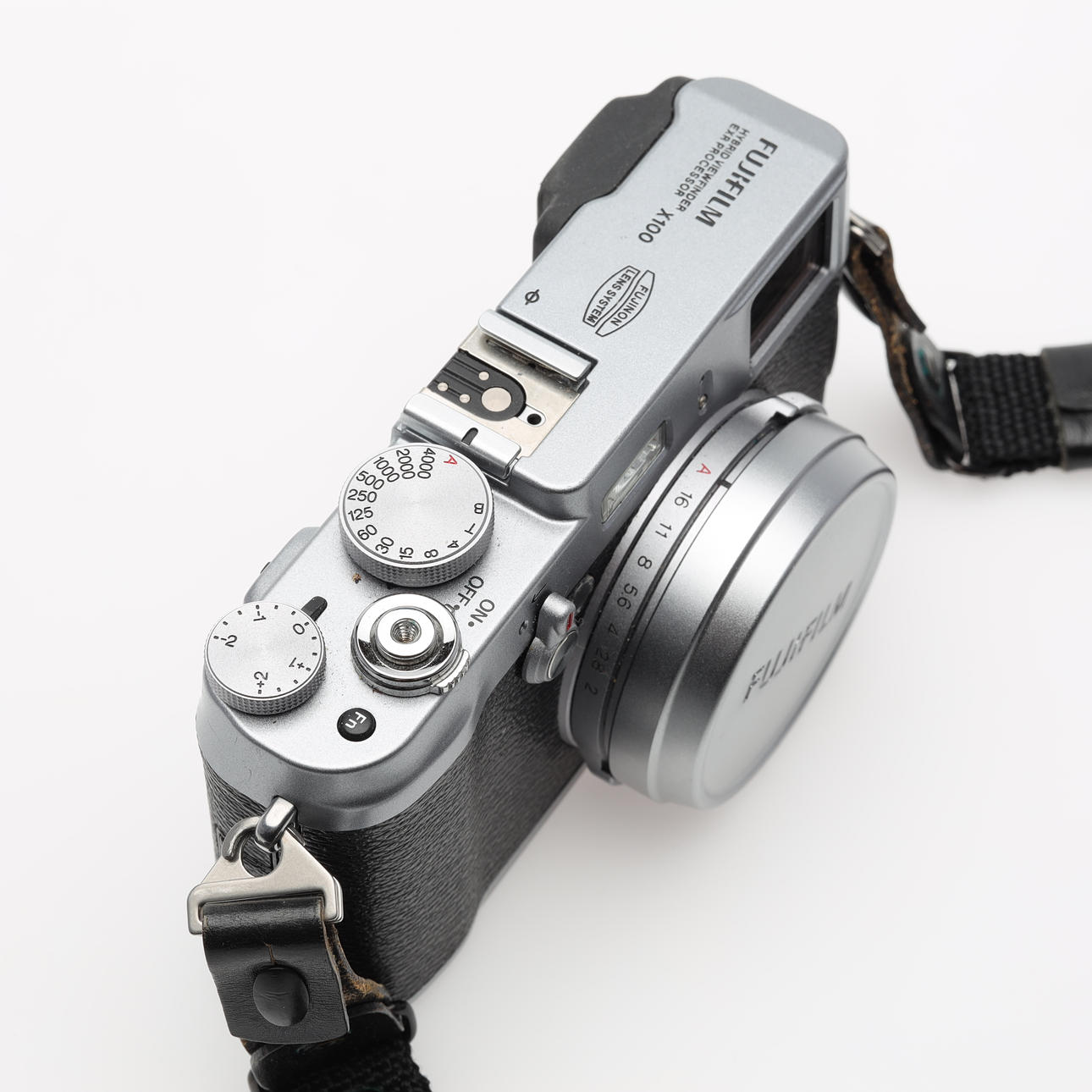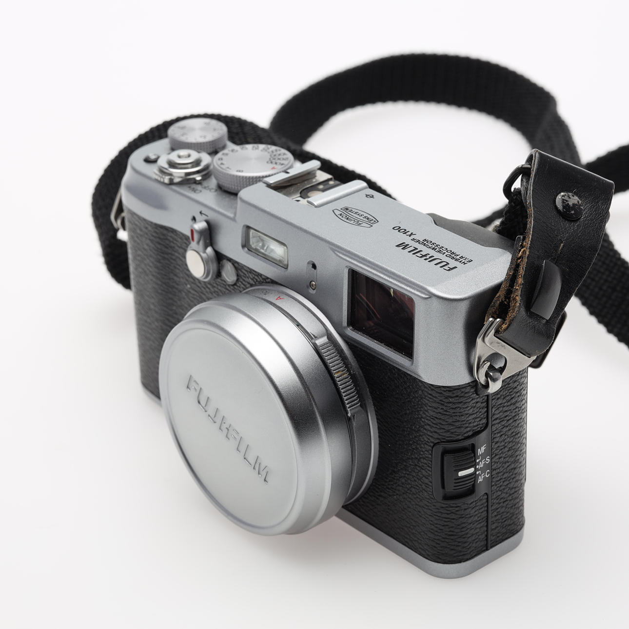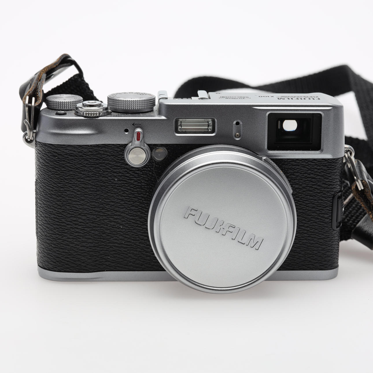 CÁMARA digital Fujifilm X100 plateada.