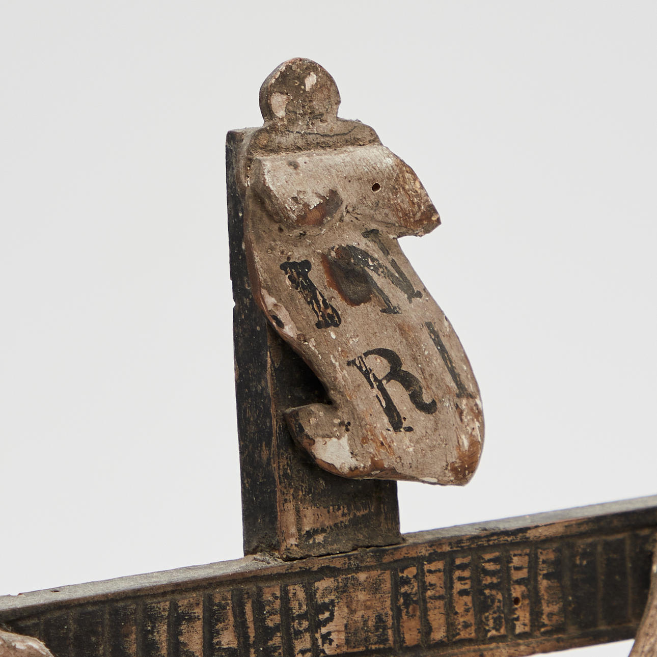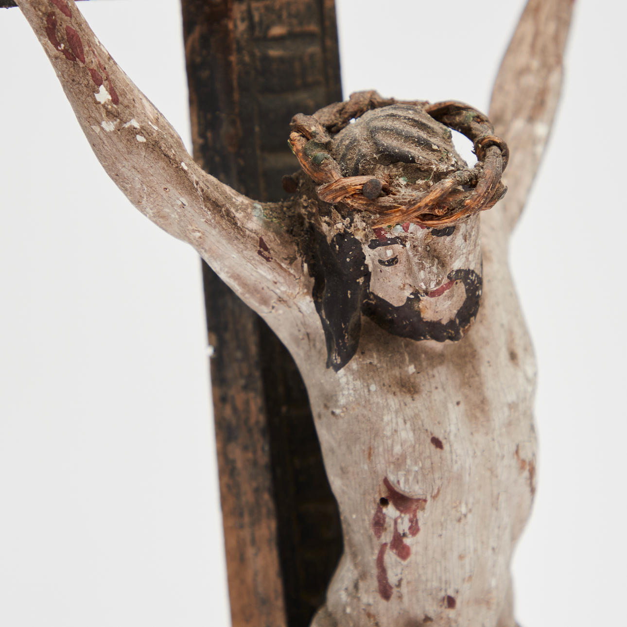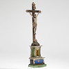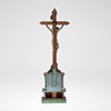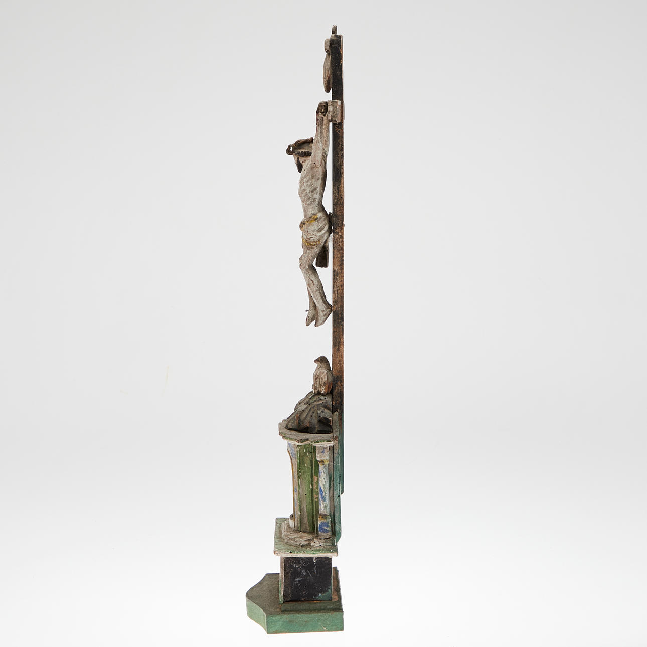 Crucifijo de madera pintada que representa a Jesús crucificado, equipado con una hornacina de altar con motivos de altar giratorios, montado sobre una base y un zócalo, 60 cm de alto, 18,5 cm de ancho y 10 cm de profundidad.