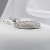 El colgante mide 24 x 19 mm. Más de 200 CZs engastados en el corazón y el lazo, y tiene un atractivo estampado de filigrana en el reverso.