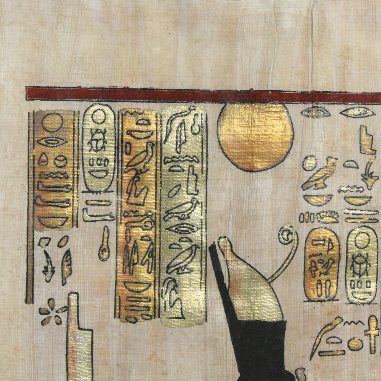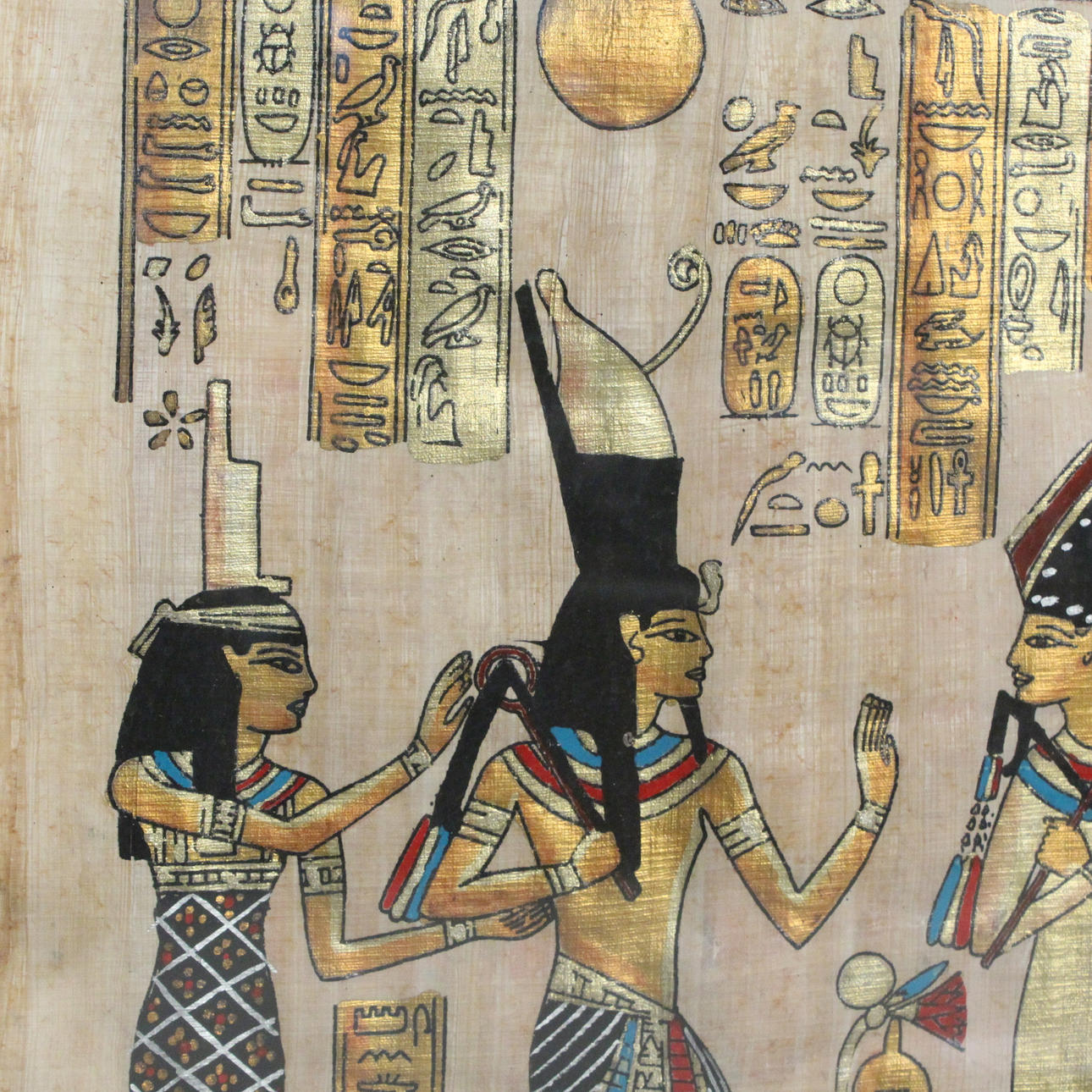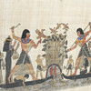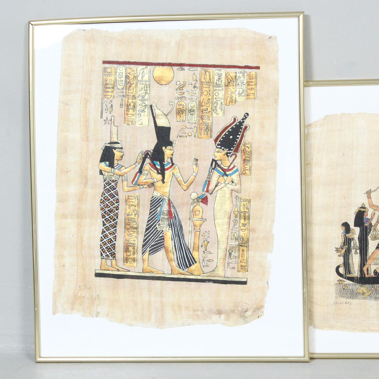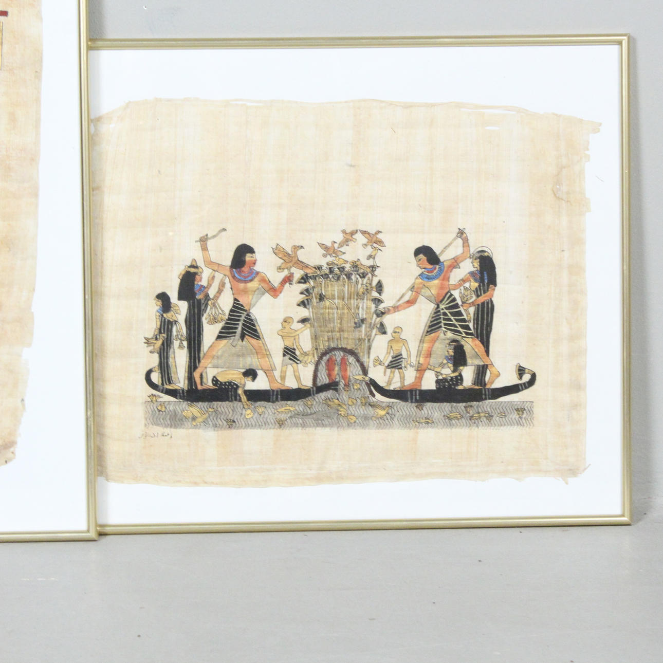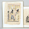Gouache sobre papiro, «paisaje egipcio», enmarcado detrás de un cristal. Tamaño de la imagen: 44 x 33 cm Tamaño del marco: 52 x 42 cm.