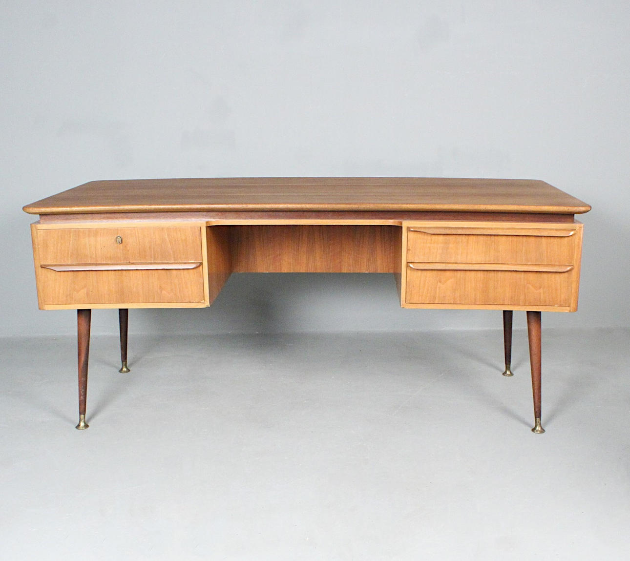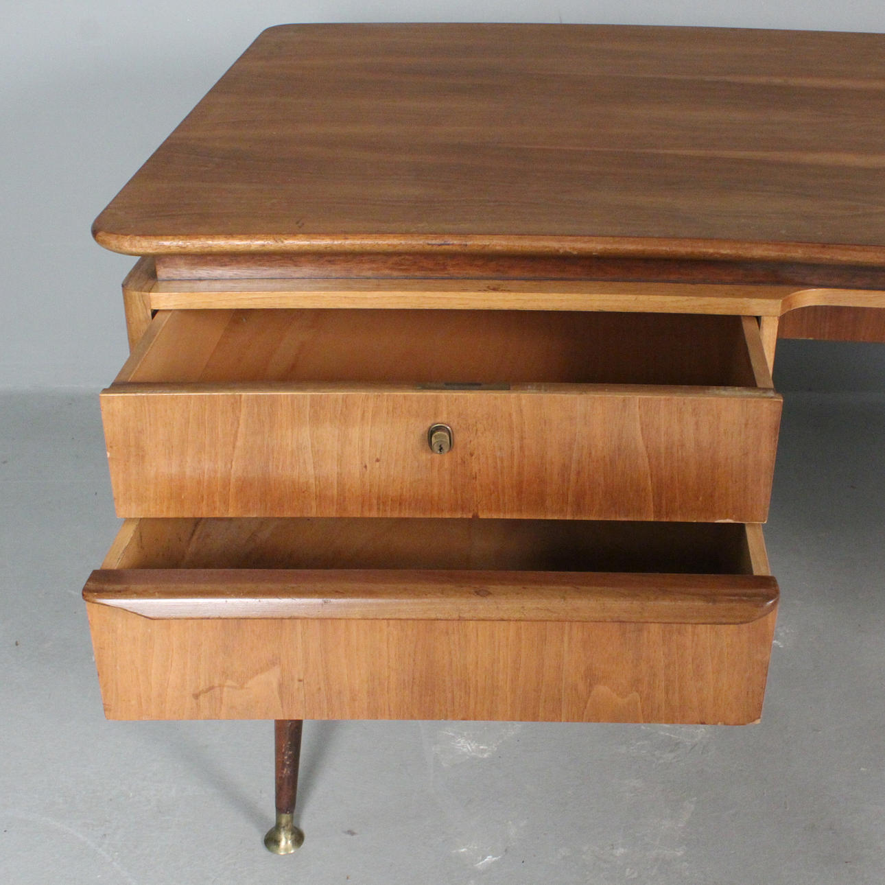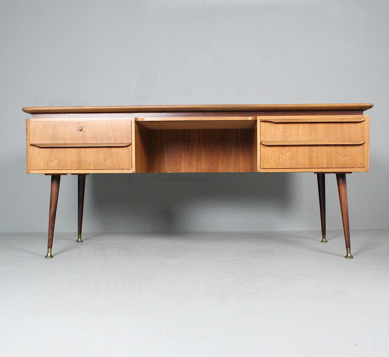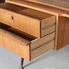 Erwin Behr, escritorio de la década de 1950, madera maciza con cuatro cajones, tablero de nogal chapado, patas inclinadas con pies de latón, tablero de mesa de forma orgánica, respaldo con estante y estante extraíble,