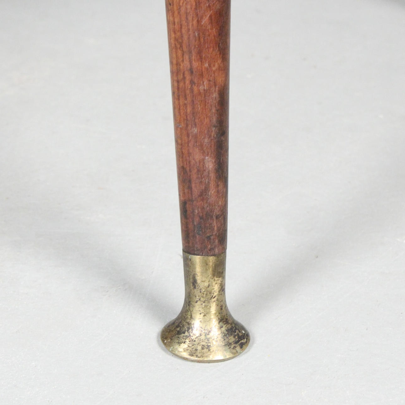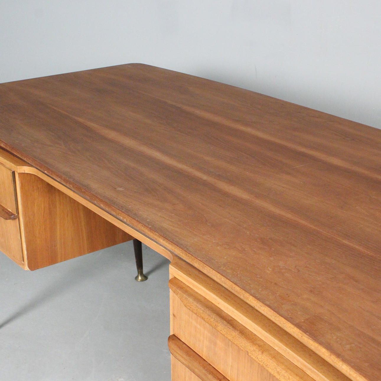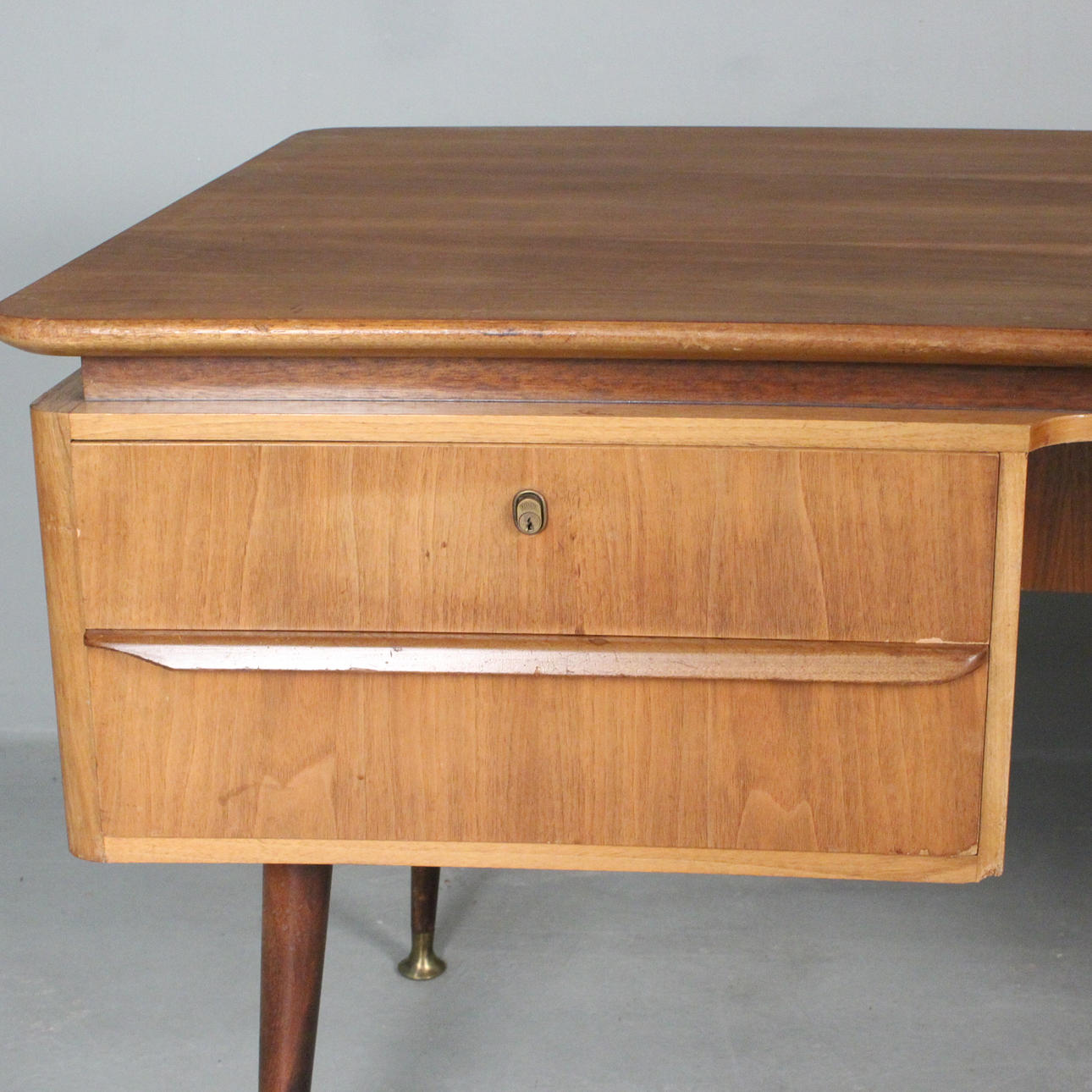 Erwin Behr, escritorio de la década de 1950, madera maciza con cuatro cajones, tablero de nogal chapado, patas inclinadas con pies de latón, tablero de mesa de forma orgánica, respaldo con estante y estante extraíble,