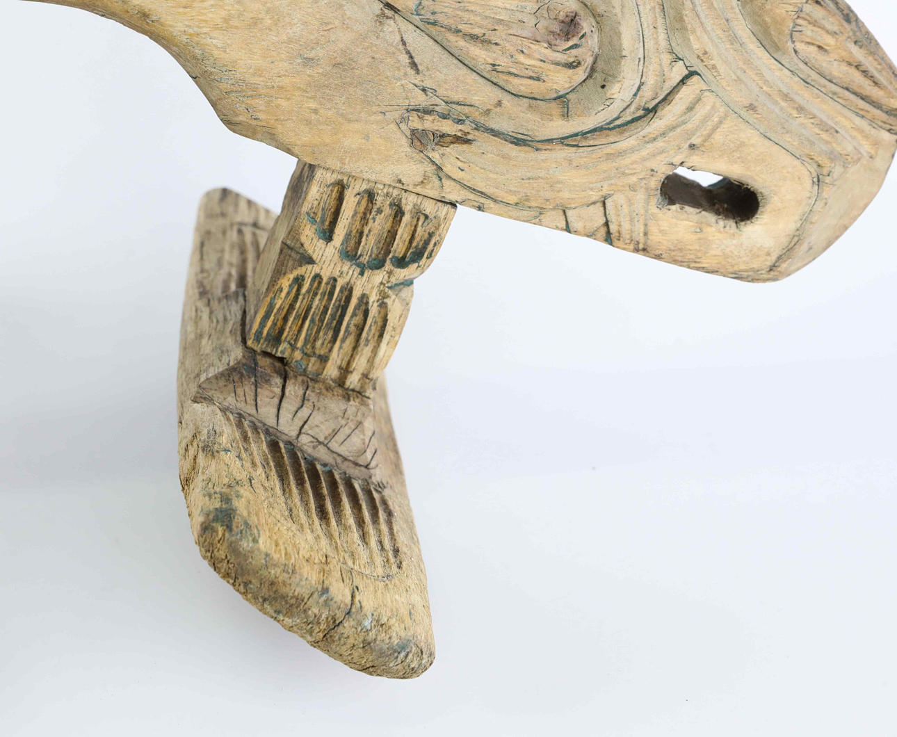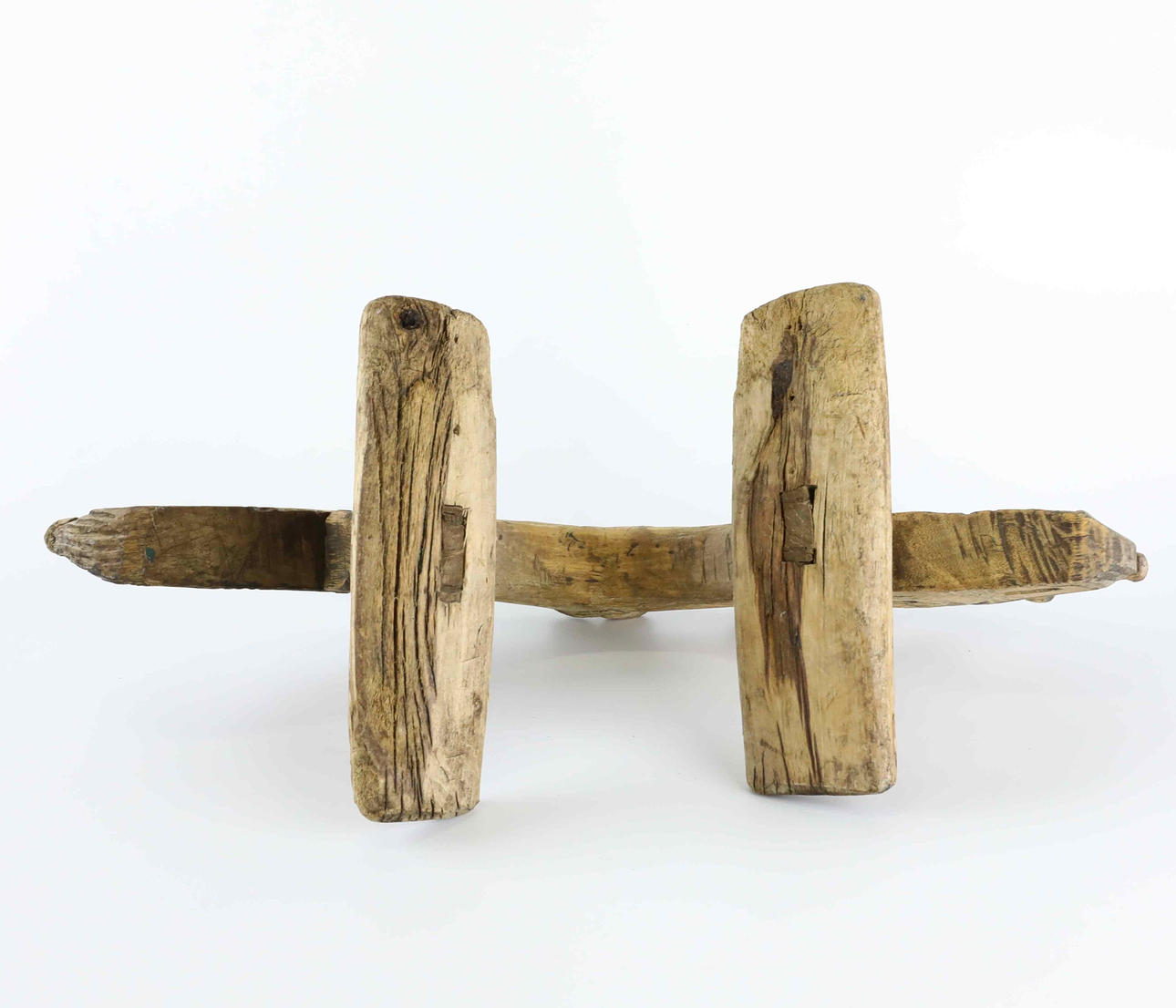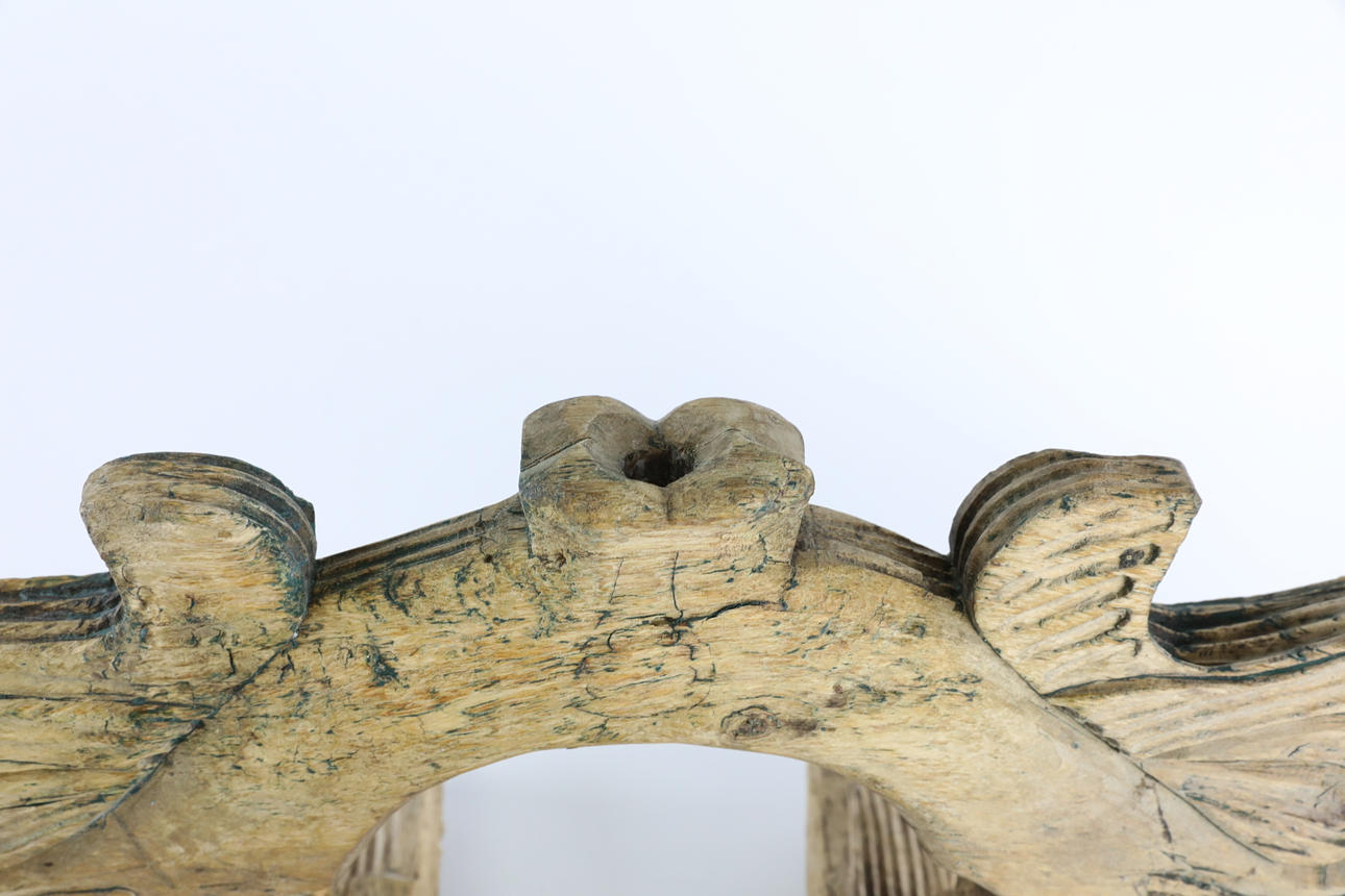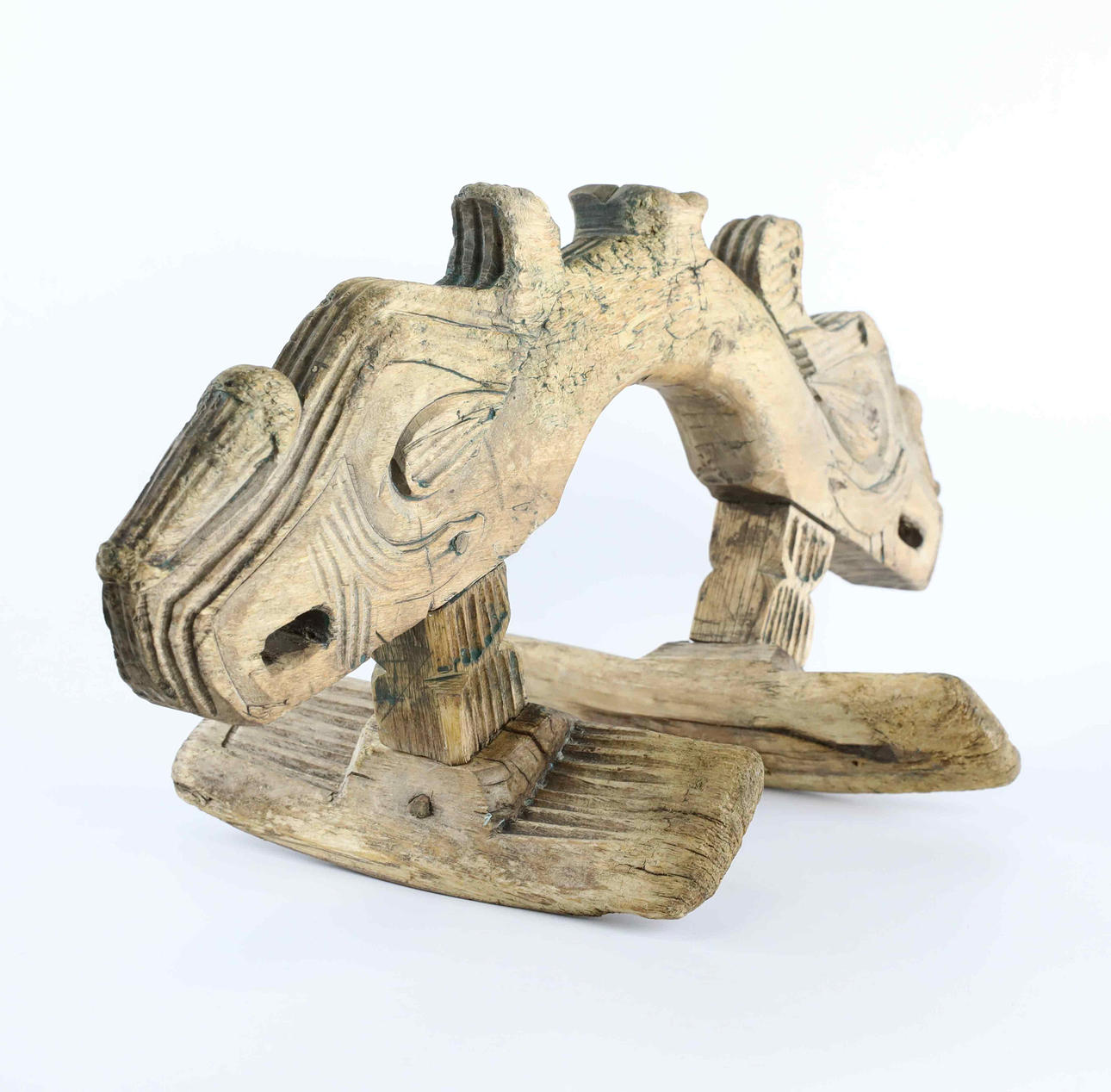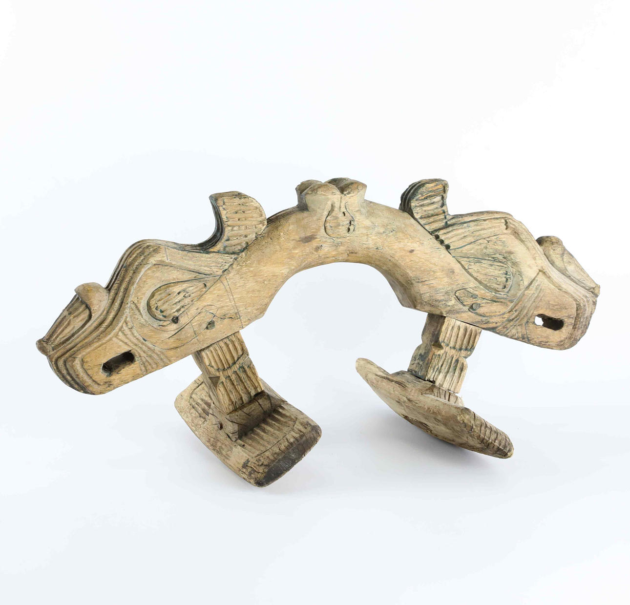 Hecho de madera, unido con tacos de madera. Decoración tallada en forma de figuras de dragones.