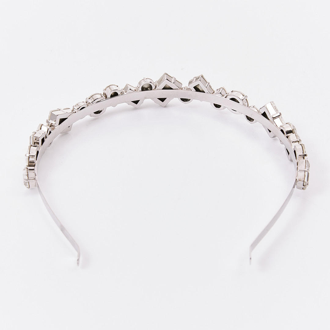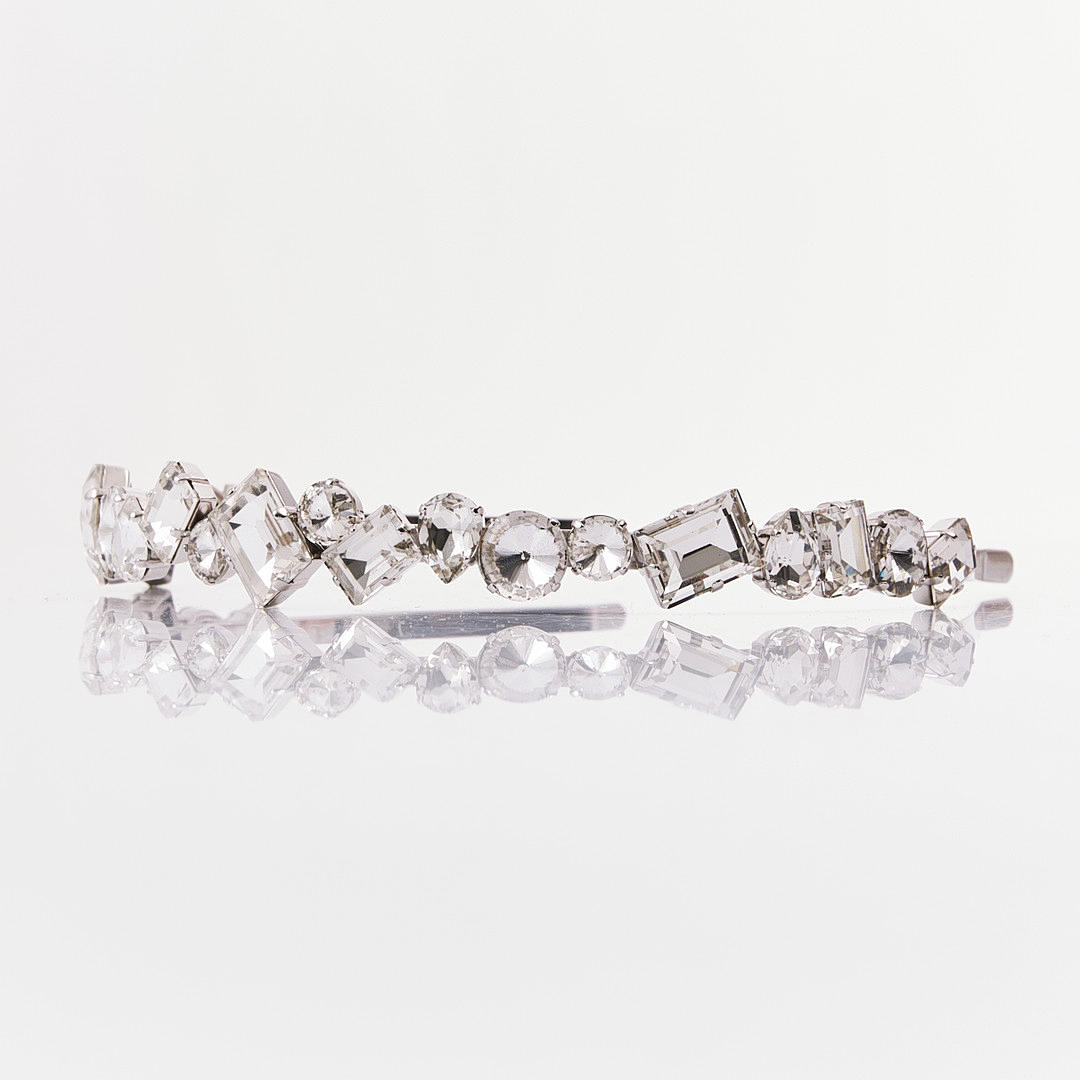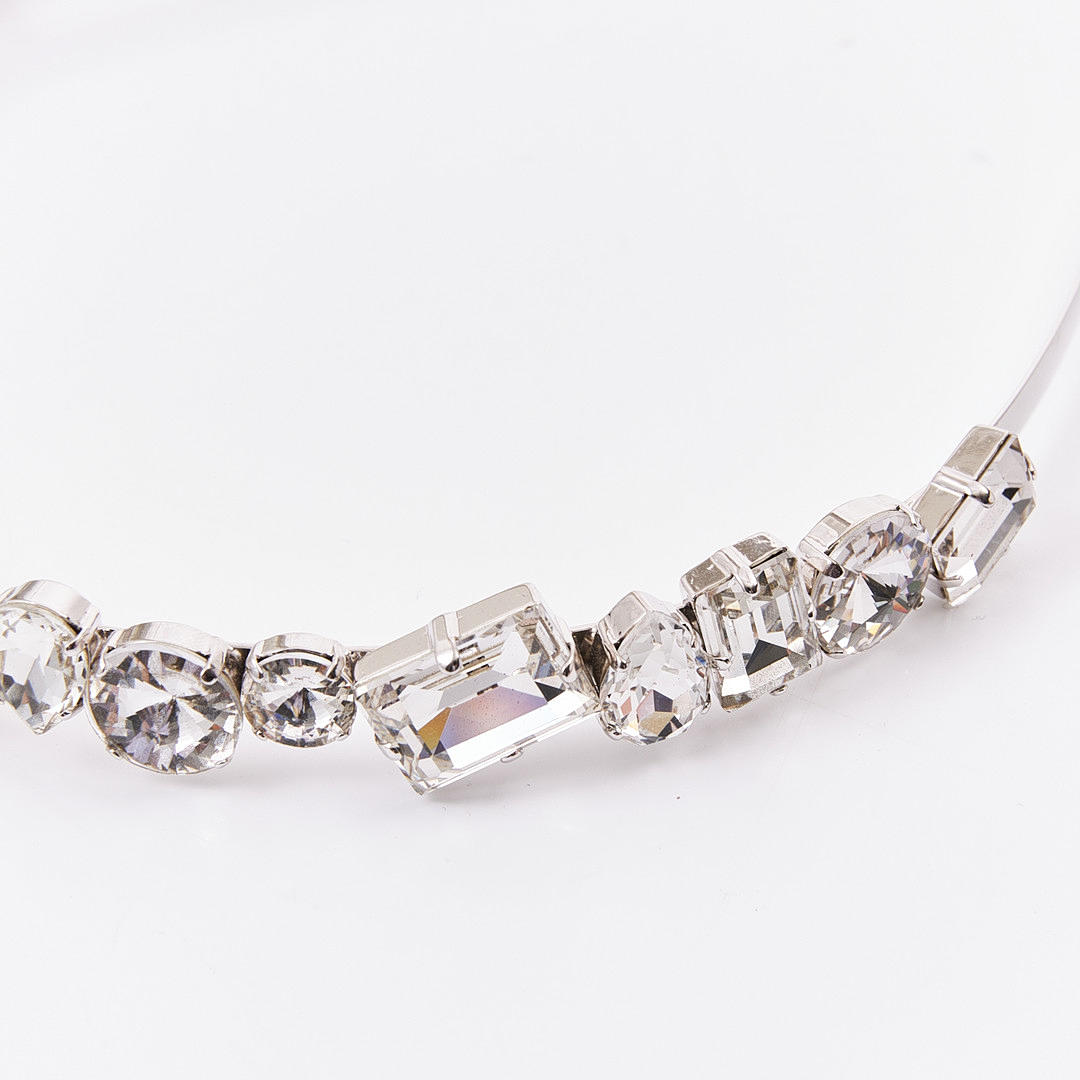 metal blanco con piedras de vidrio tallado, con la inscripción «MIU MIU MADE IN ITALY».