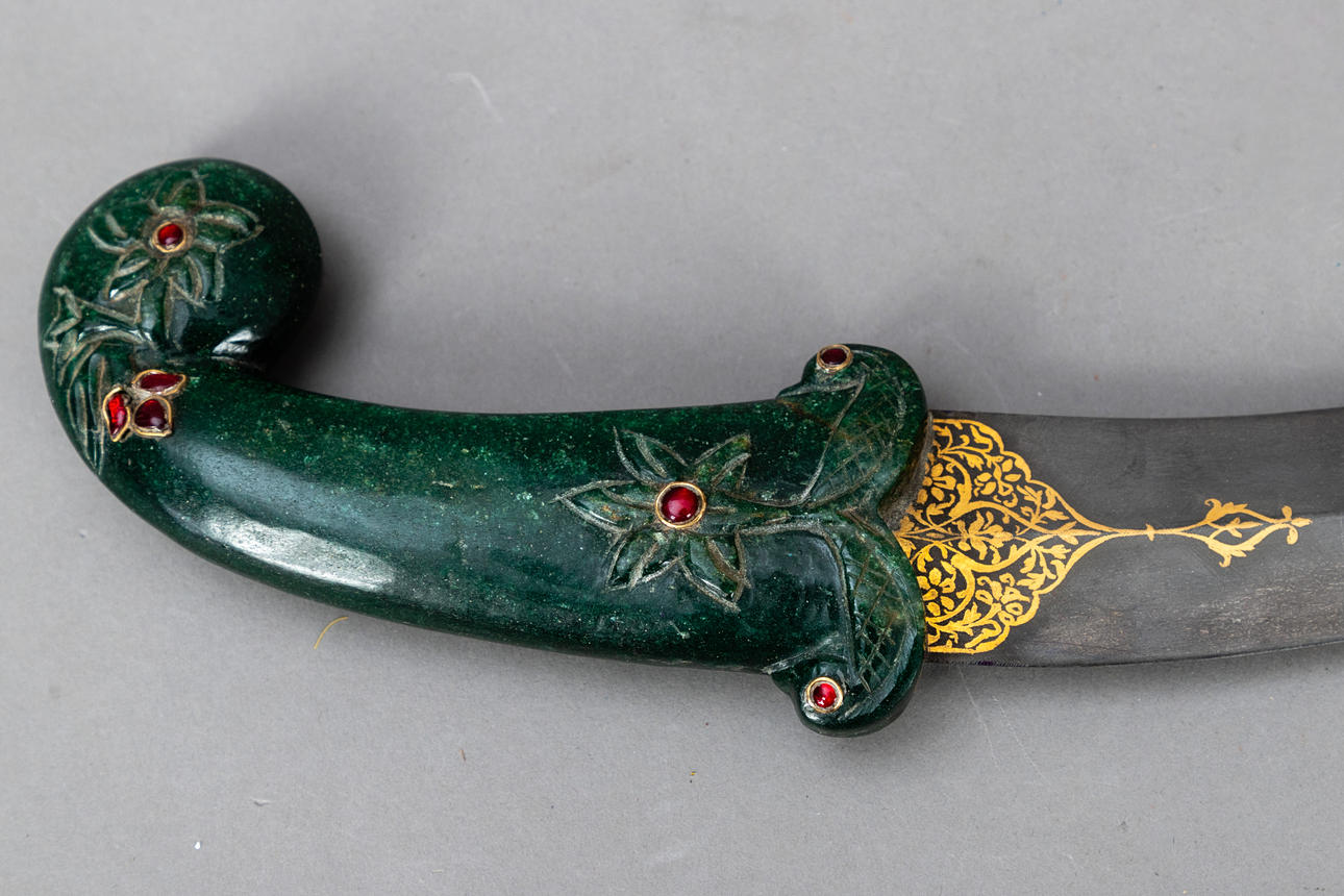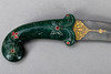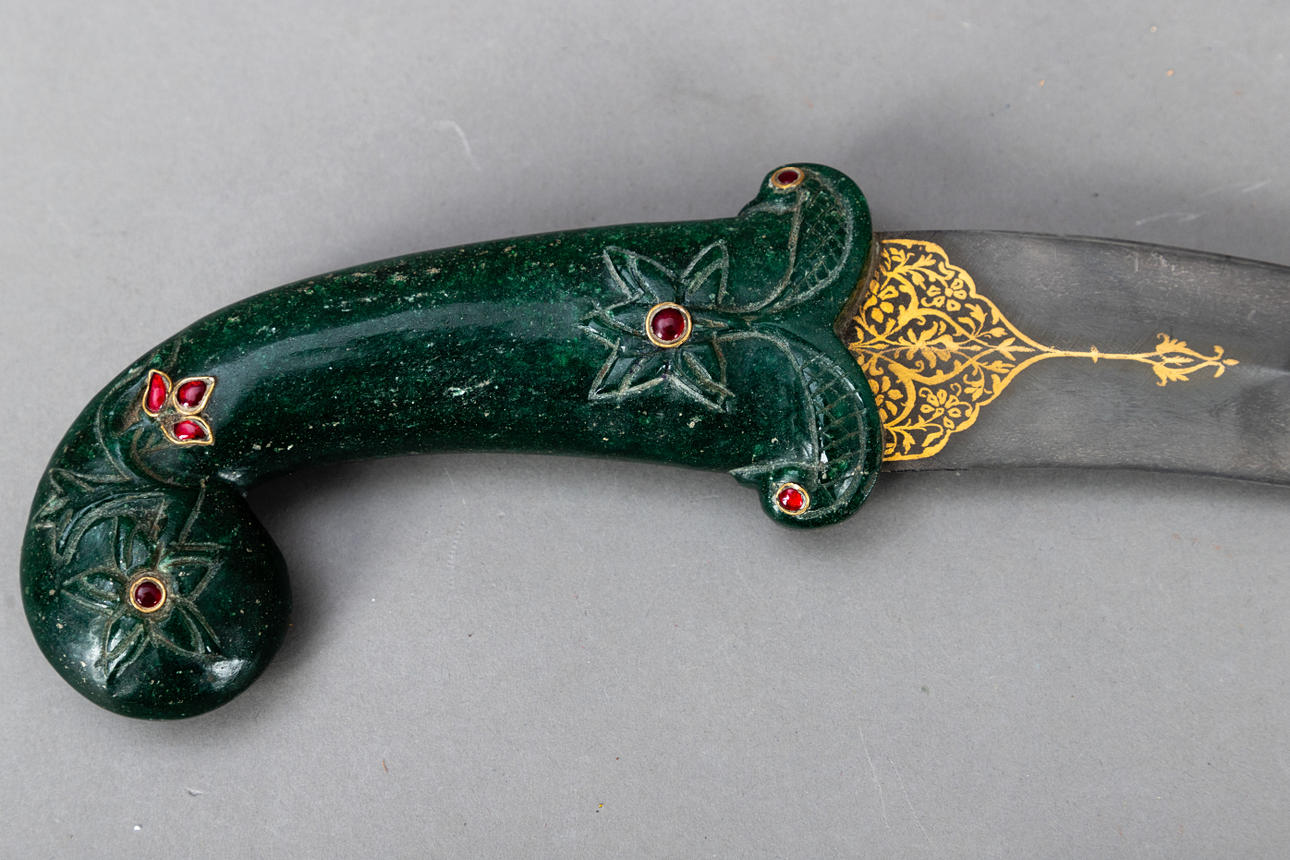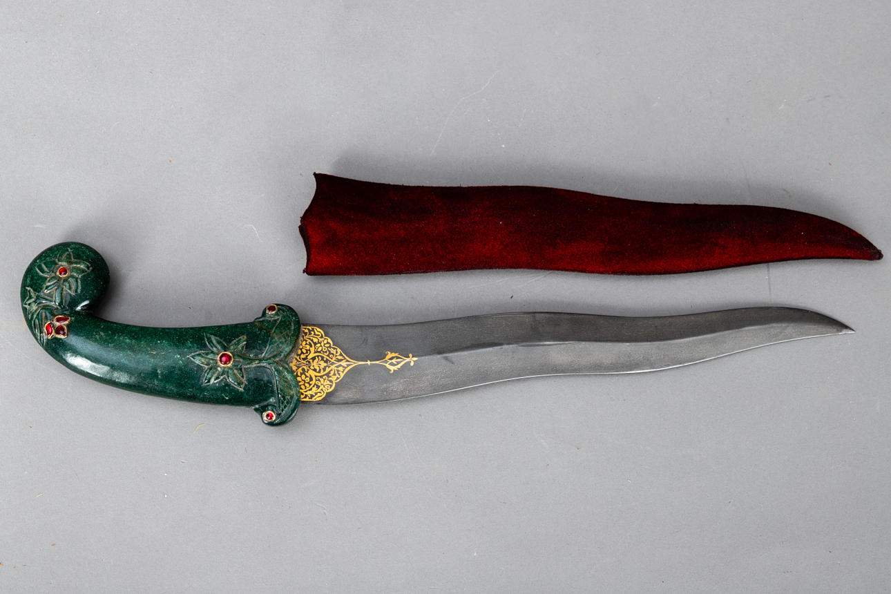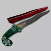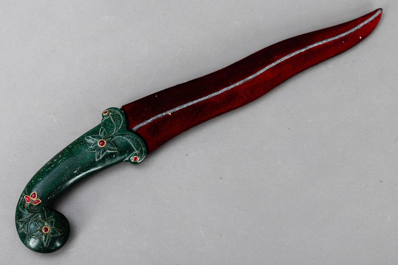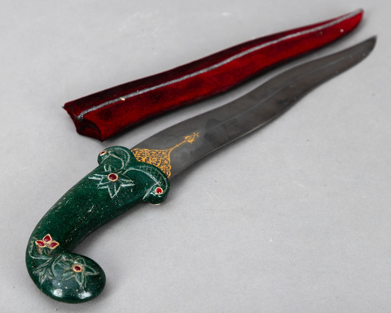 Daga Kandshar, India, siglo XX, hoja de damasco Wootz ondulada de doble filo con baño dorado por ambos lados, mango de piedra semipreciosa de color verde oscuro con estampado floral e incrustaciones de piedras rojas, además de una vaina a juego cubierta de terciopelo rojo.